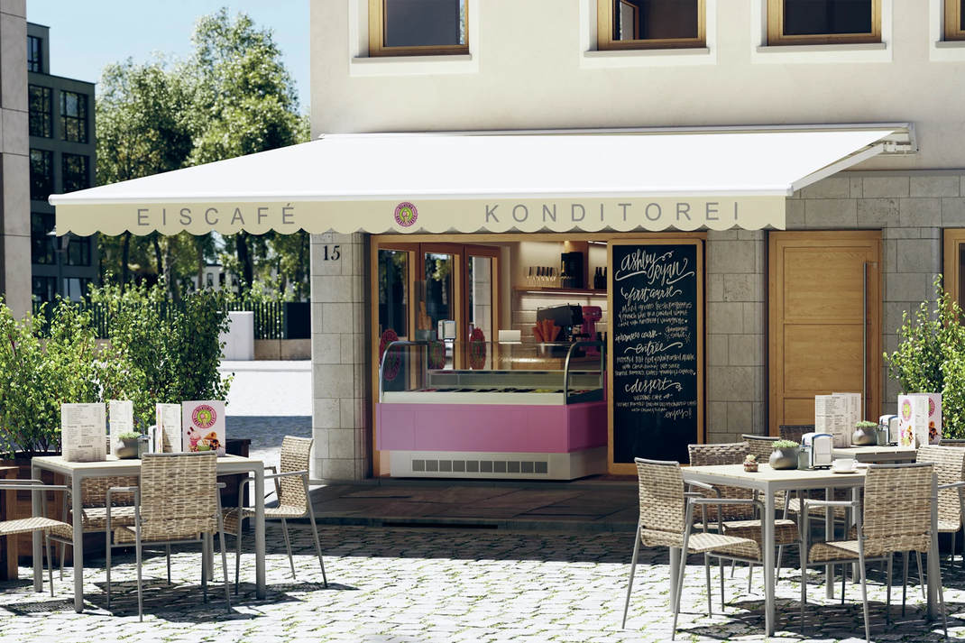 Markisen sind der Klassiker für wandnahe Terrassen. Sie bieten zuverlässigen Sonnenschutz und sind besonders geeignet für kleinere bis mittelgroße Gastronomieflächen.