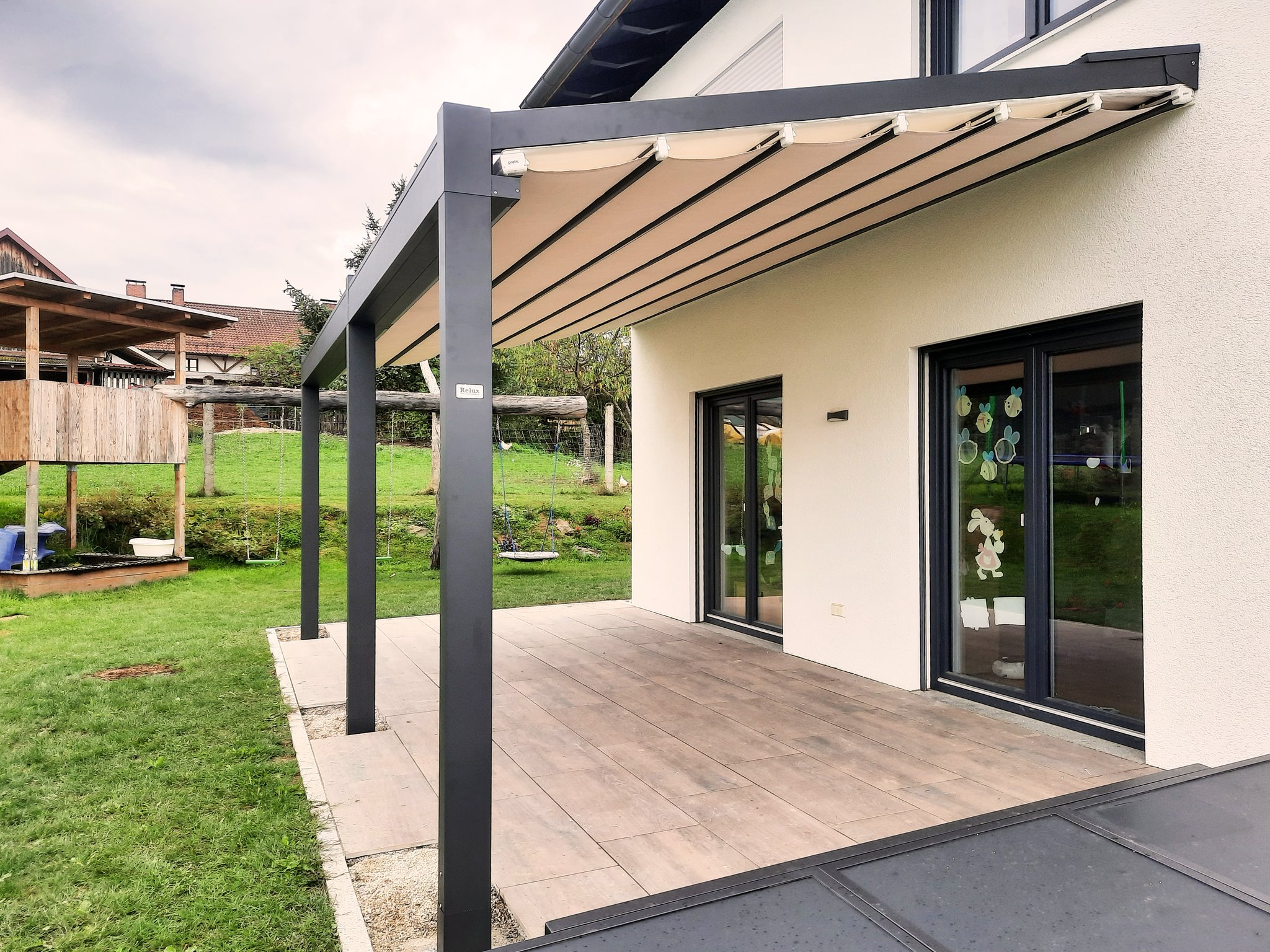 Eine Faltdachpergola von Pratic bestehend aus zwei gekoppelten Anlagen. Zusätzlichen Schutz bieten zwei integrierte Screens.