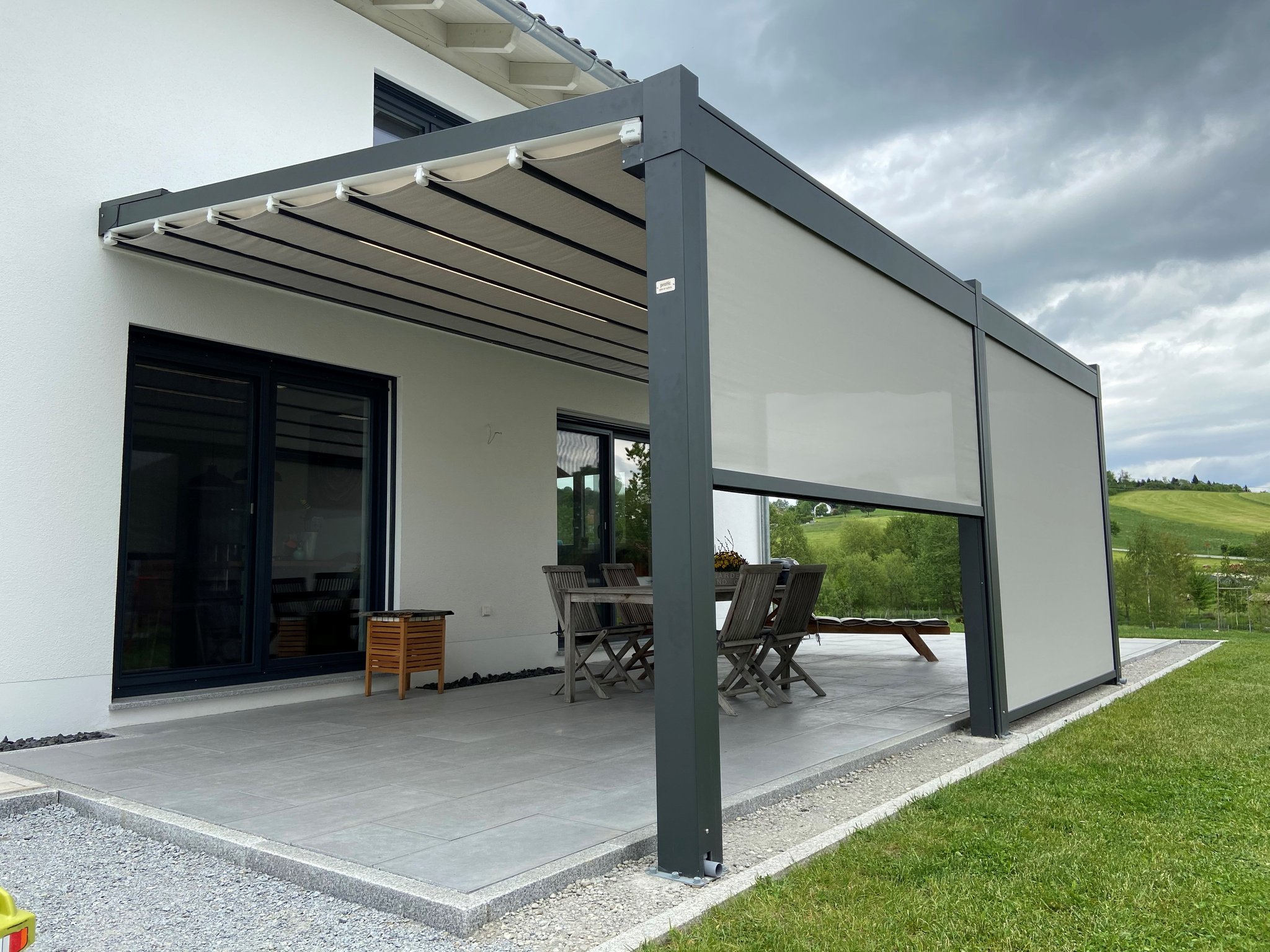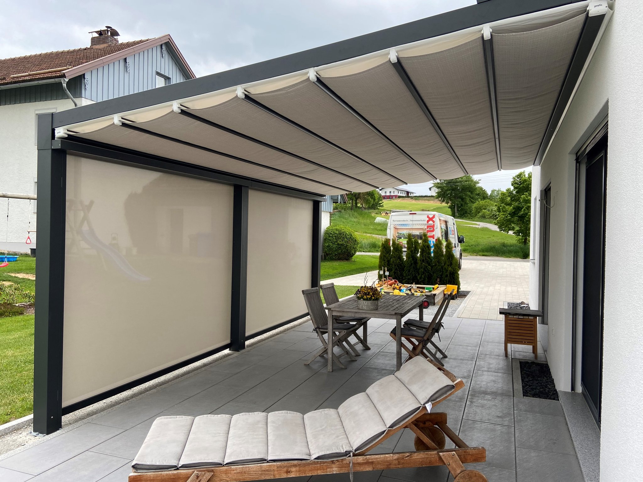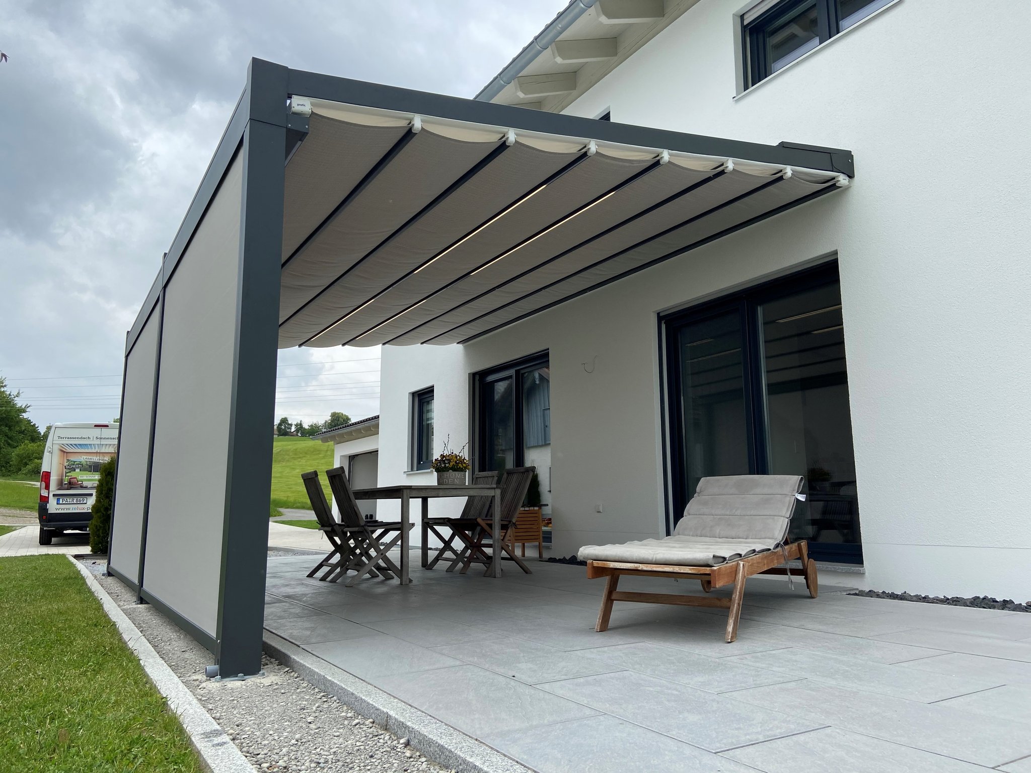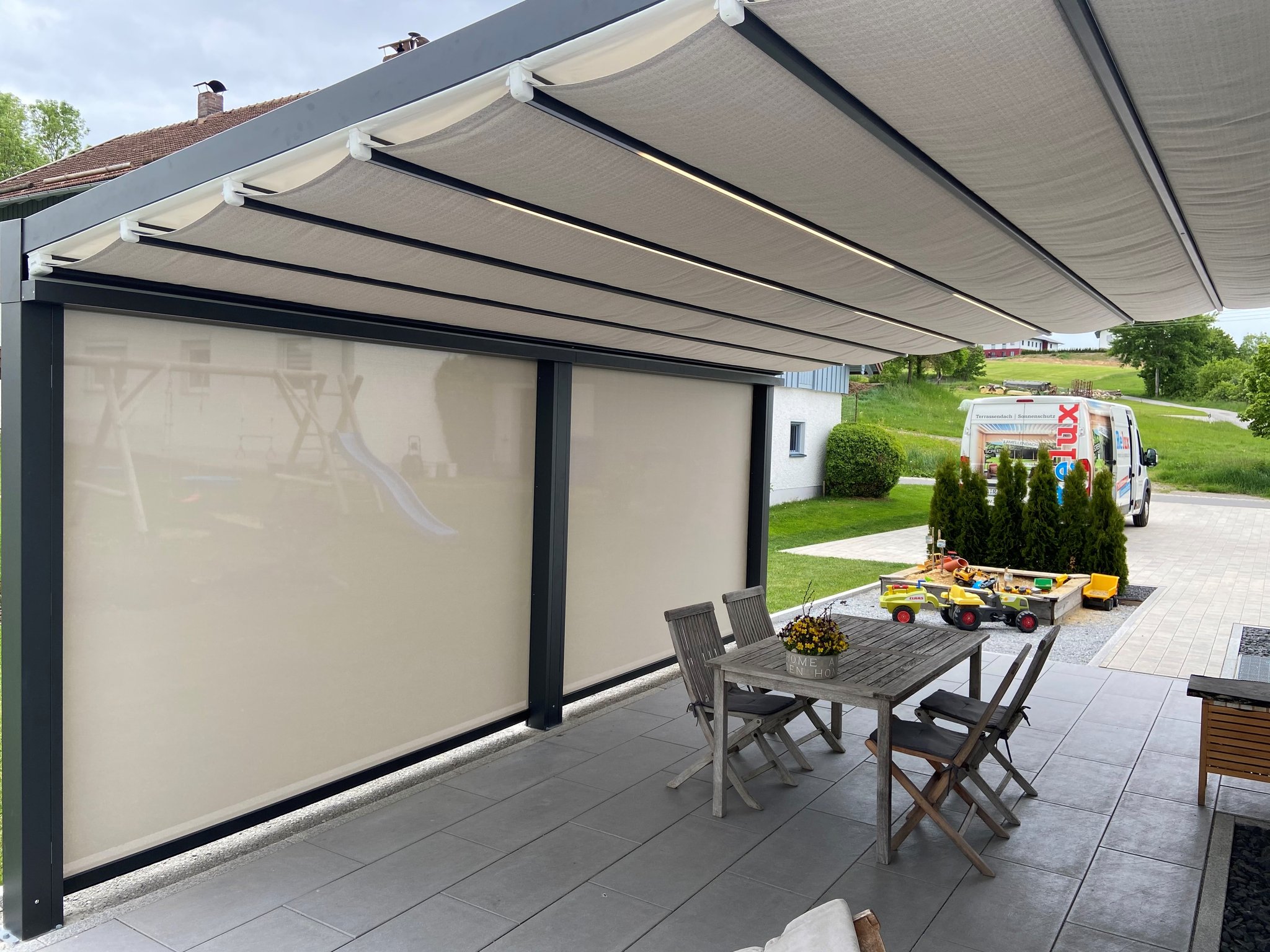 Faltdachpergola Pratic Fusion, 4x6 m. Ausführung mit drei Pfosten, zwei Screens auf der Südseite, dekoratives Untertuch und integrierte LED-Beleuchtung