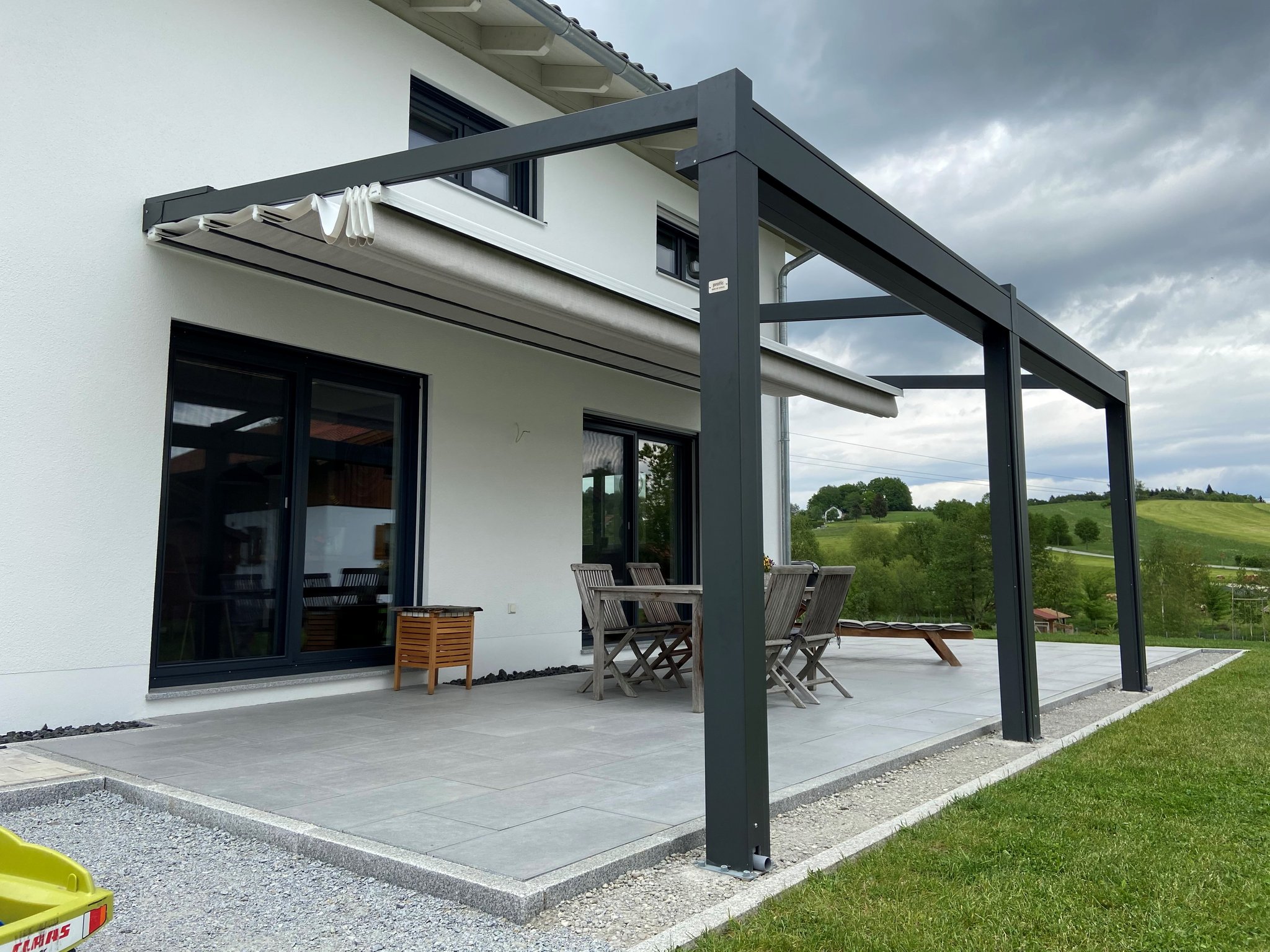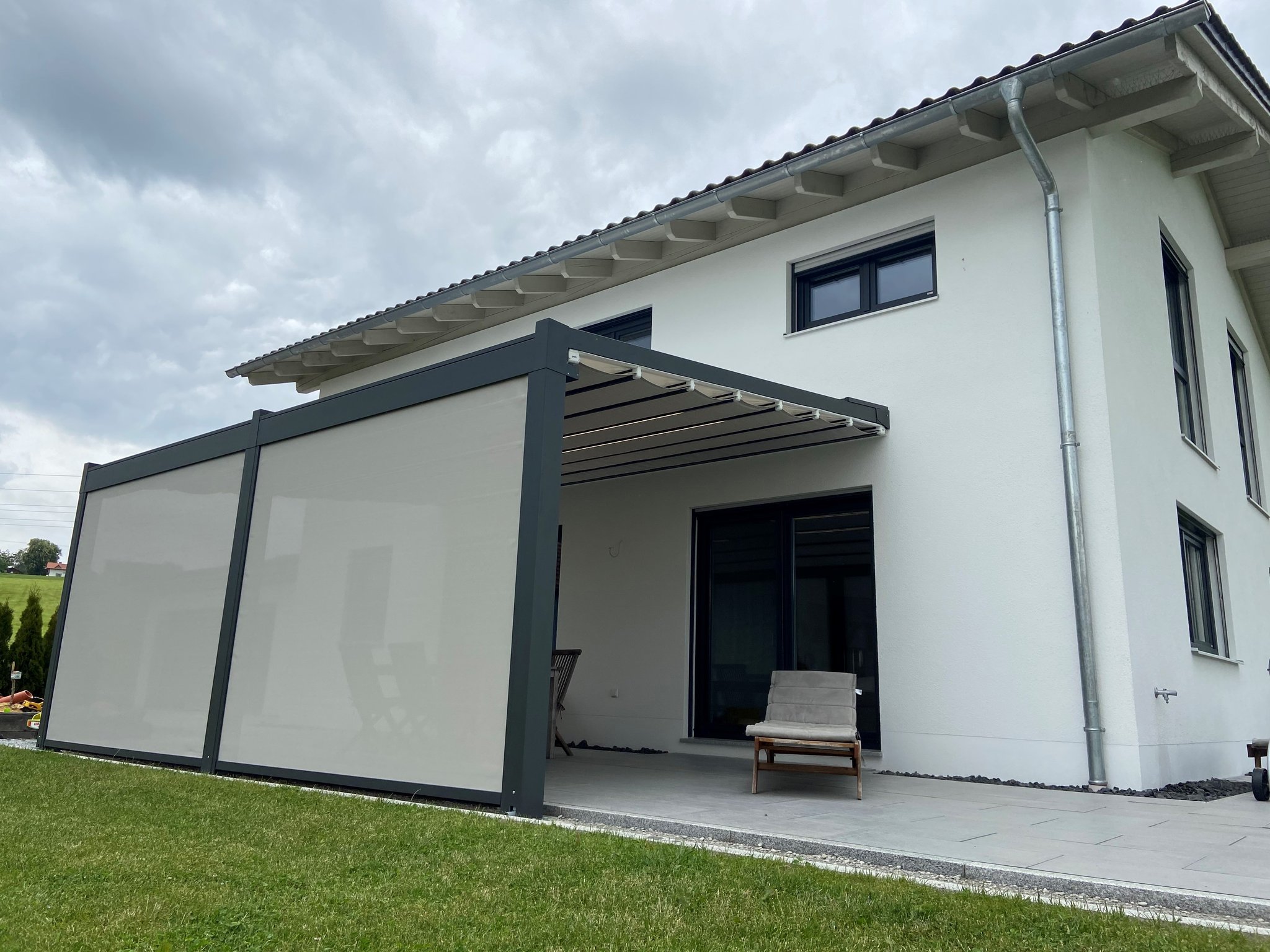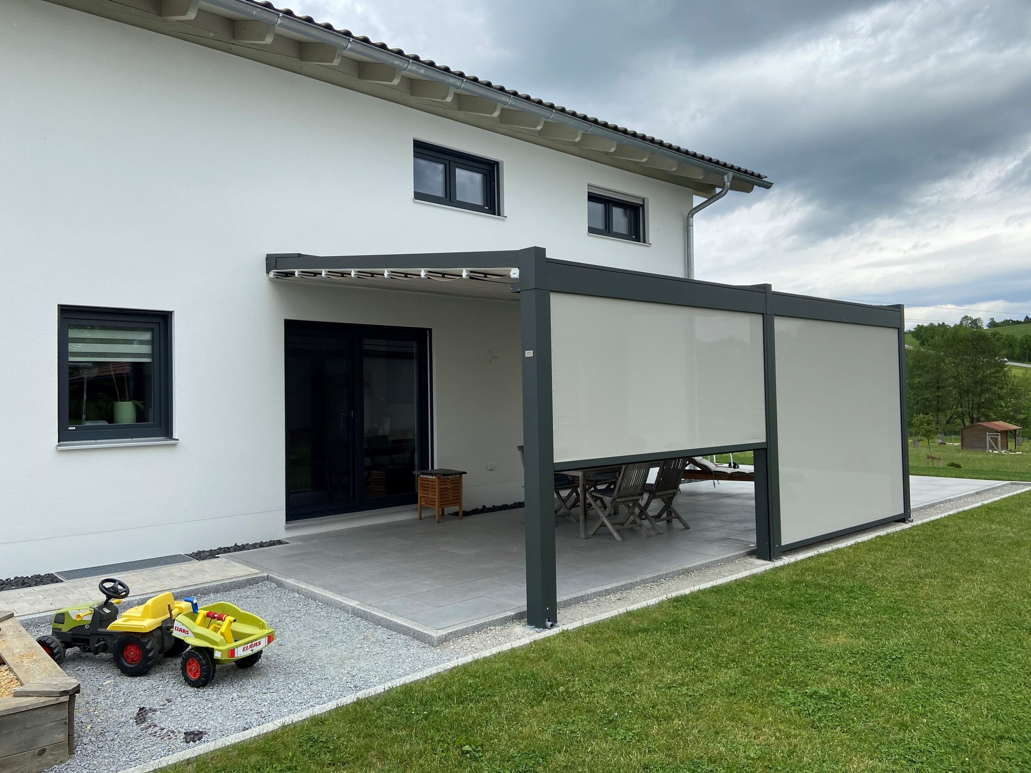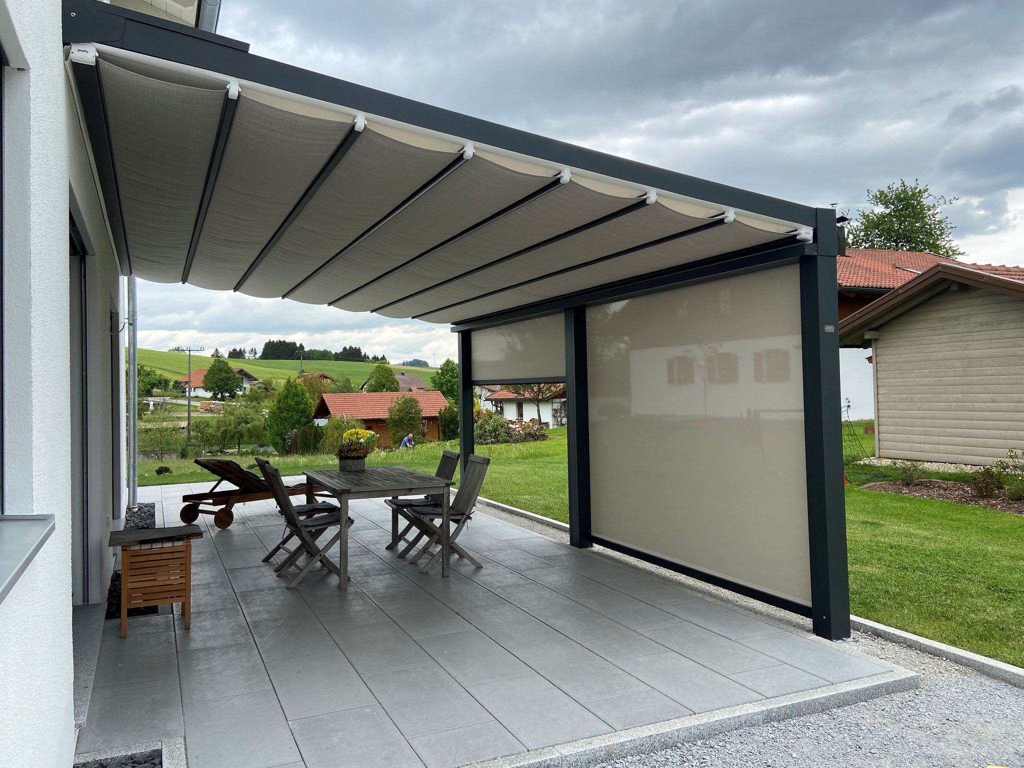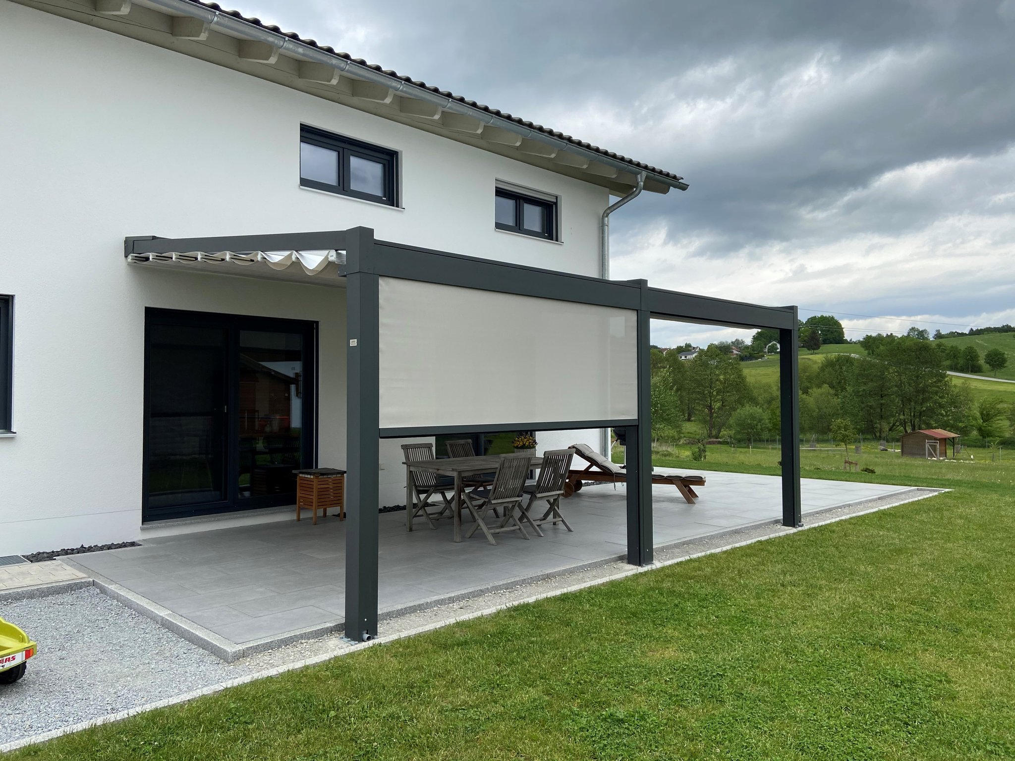 Faltdachpergola Pratic Fusion, 4x6 m. Ausführung mit drei Pfosten, zwei Screens auf der Südseite, dekoratives Untertuch und integrierte LED-Beleuchtung