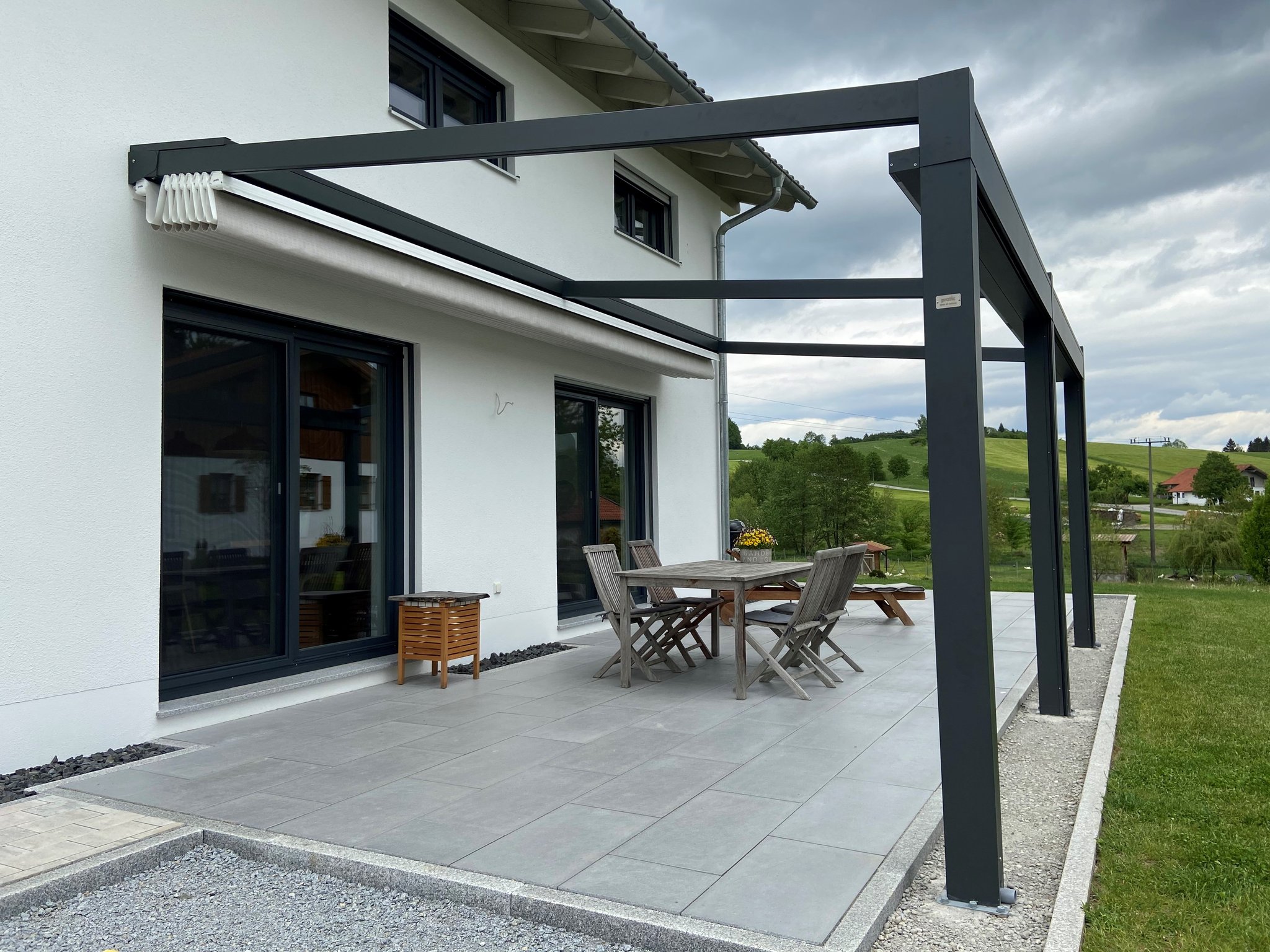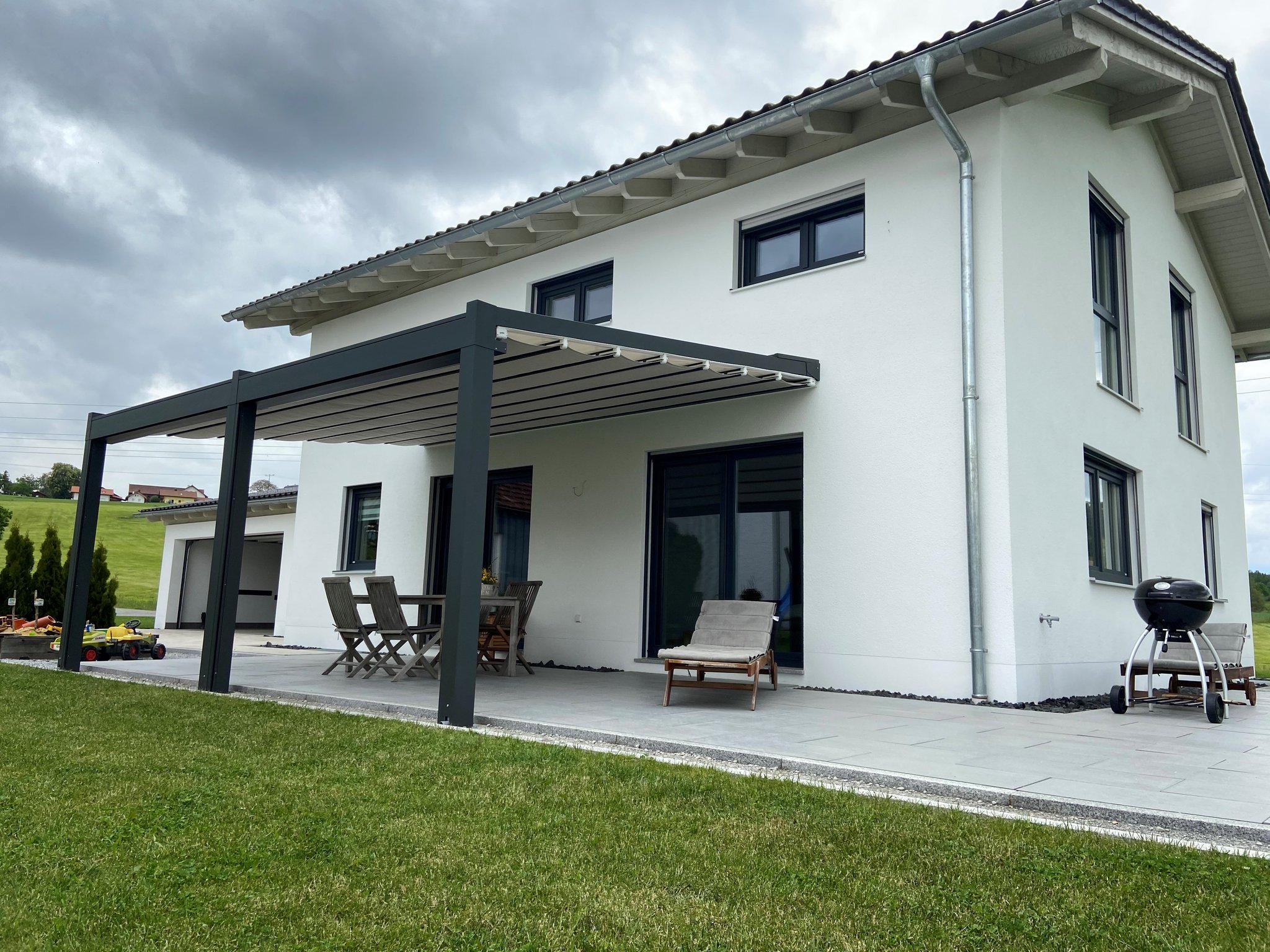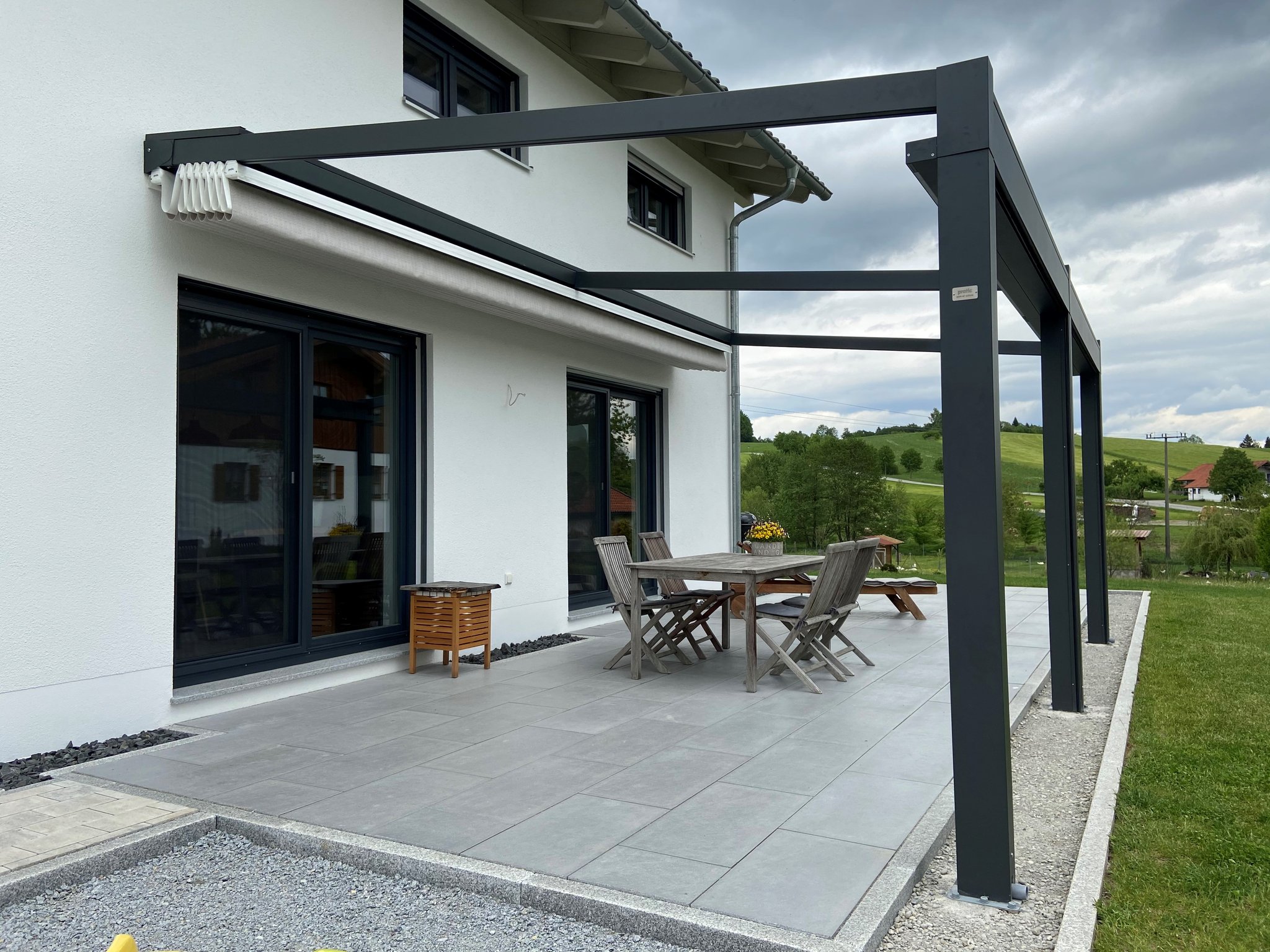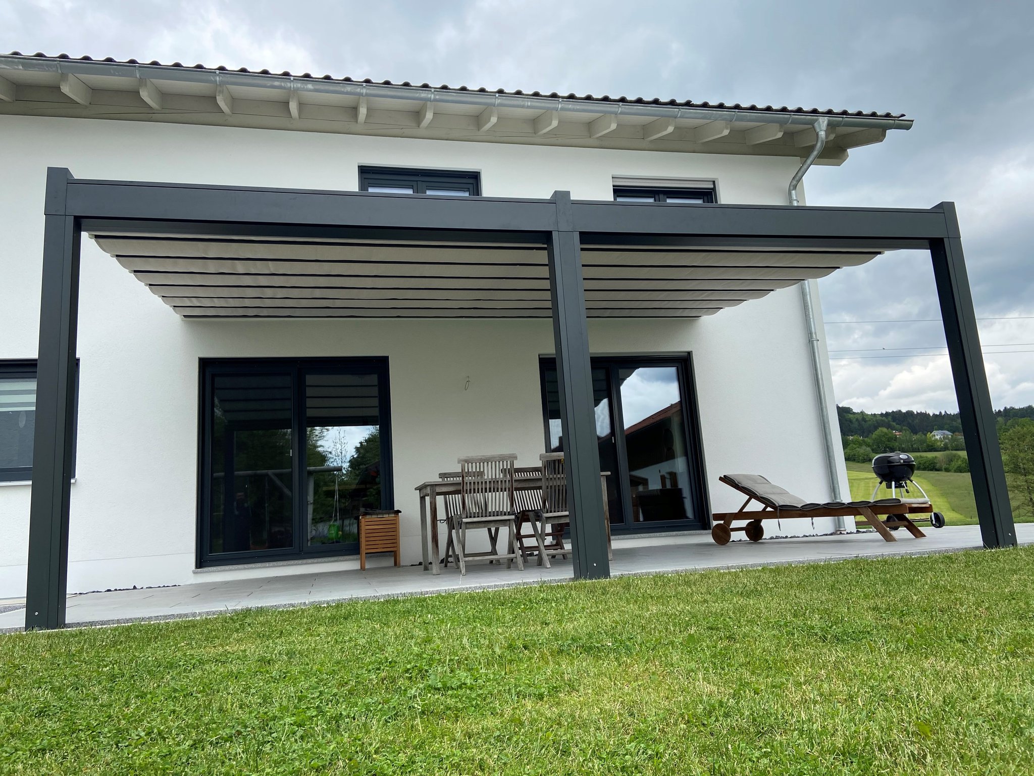 Faltdachpergola Pratic Fusion, 4x6 m. Ausführung mit drei Pfosten, zwei Screens auf der Südseite, dekoratives Untertuch und integrierte LED-Beleuchtung
