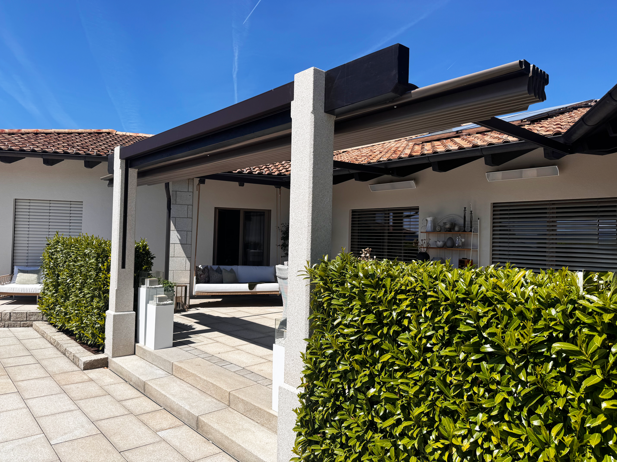 Diese Faltdachpergola ist wirklich ein ganz besonderes Projekt. Hier haben wir die komplette Planung der Terrasse übernommen. Eine echte Herausforderung, da die Terrasse nicht rechtwinklig ist