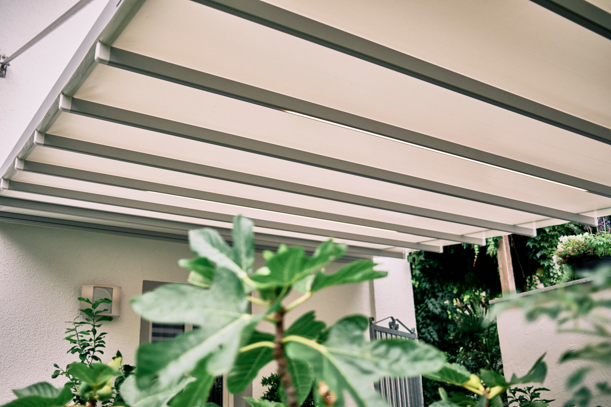 Faltdachpergola Pratic Tecnic. Montage mit Zugstangen, ohne Pfosten. Integrierte LED-Beleuchtung