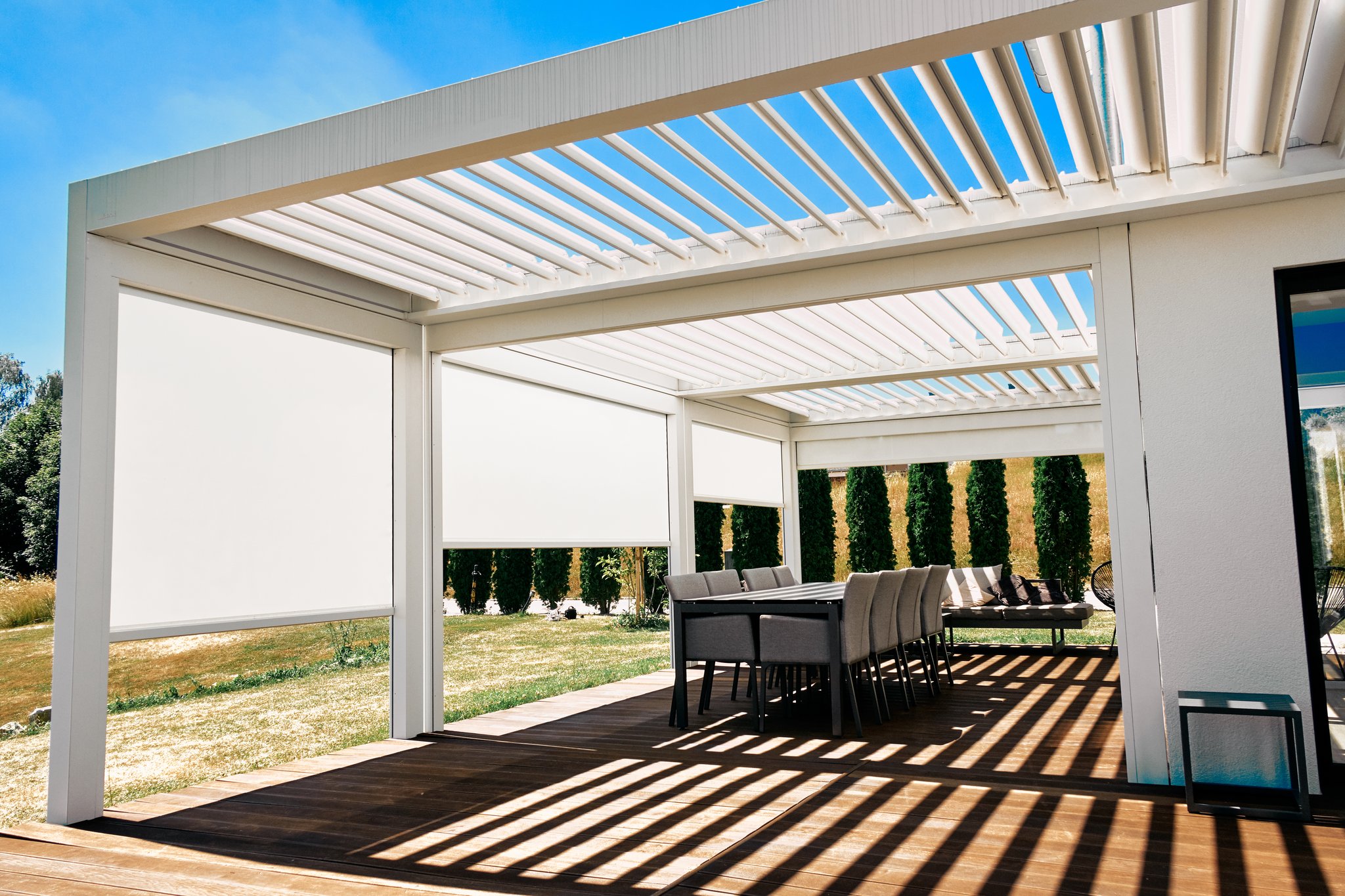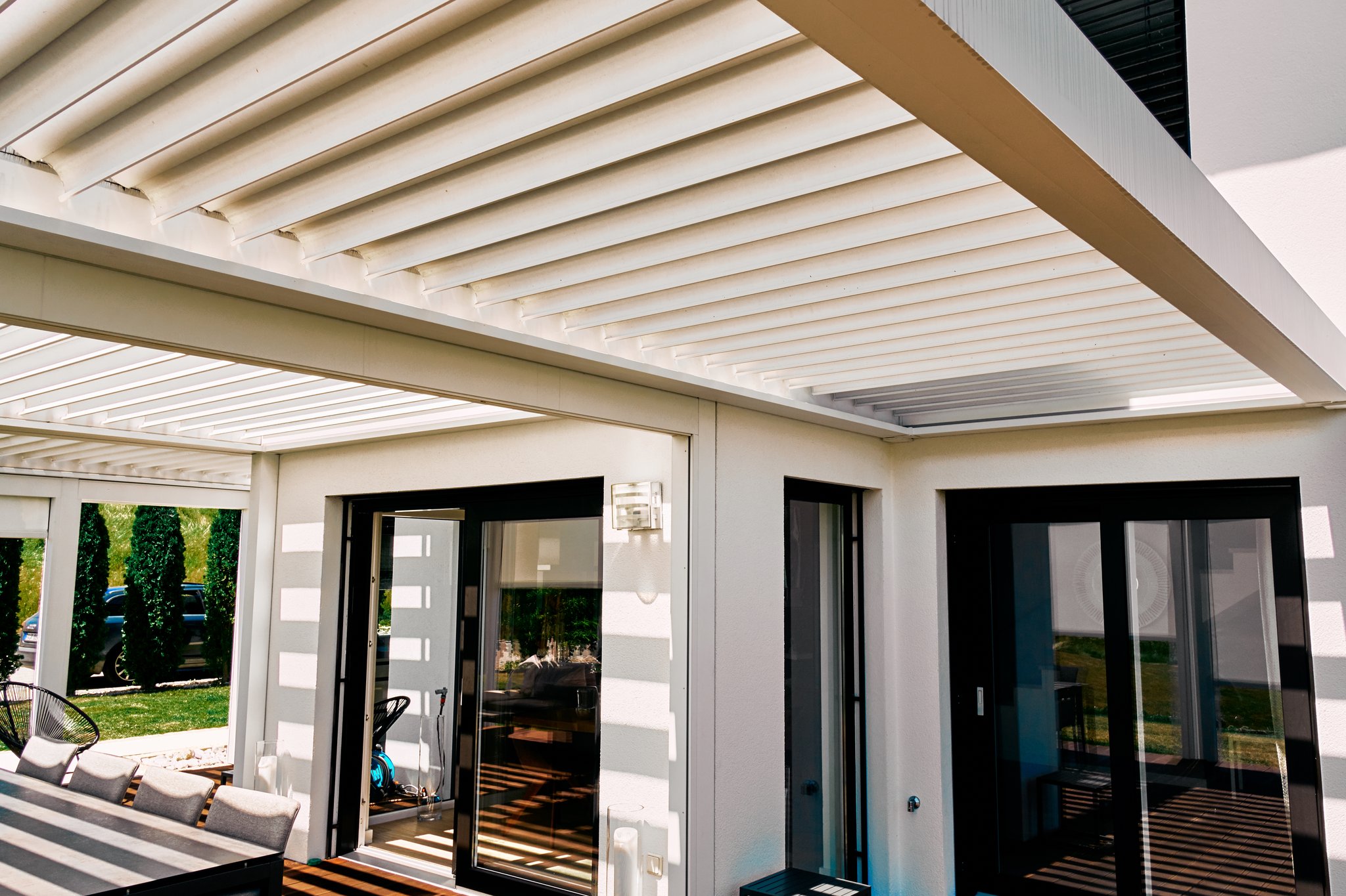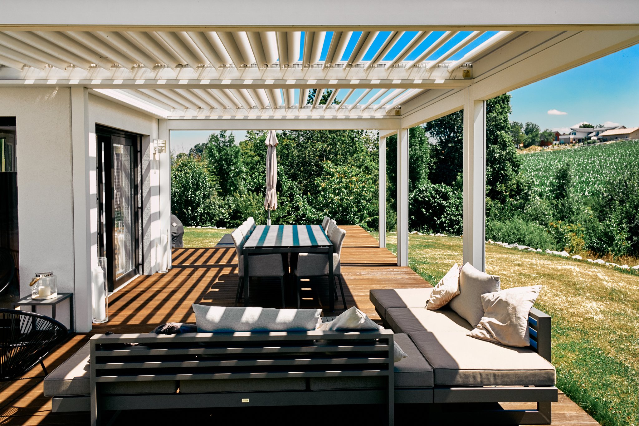 Ein zweites Wohnzimmer draußen ist bei diesem Projekt etwas untertrieben. Mit fast 60m2 überdachter Fläche hat man jede Menge trockenen und schattigen Platz auf der Terrasse. Das Cabriodach von Brustor lässt sich auch einfahren und bietet das kleinste Lamellenpaket auf dem Markt- 13% der Gesamttiefe des Lamellendachs.