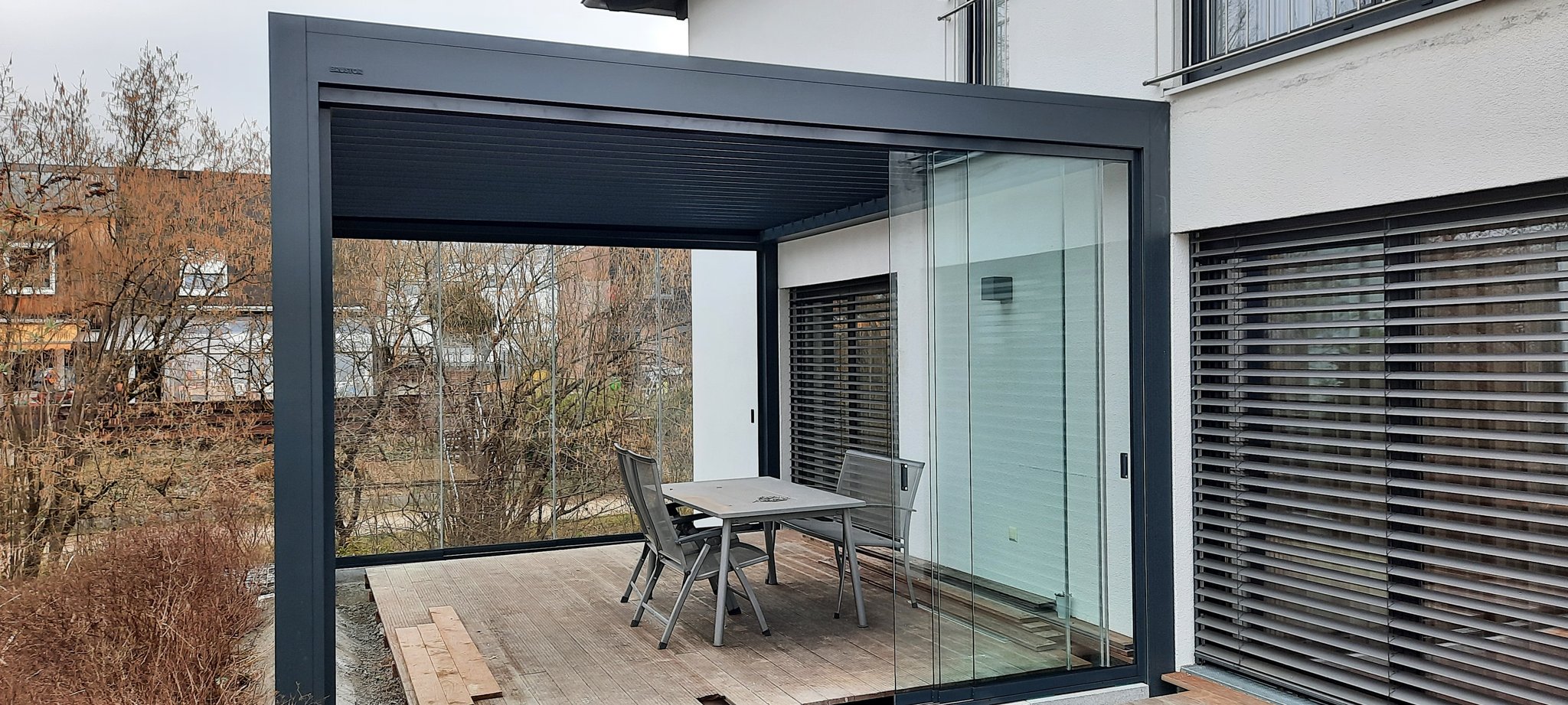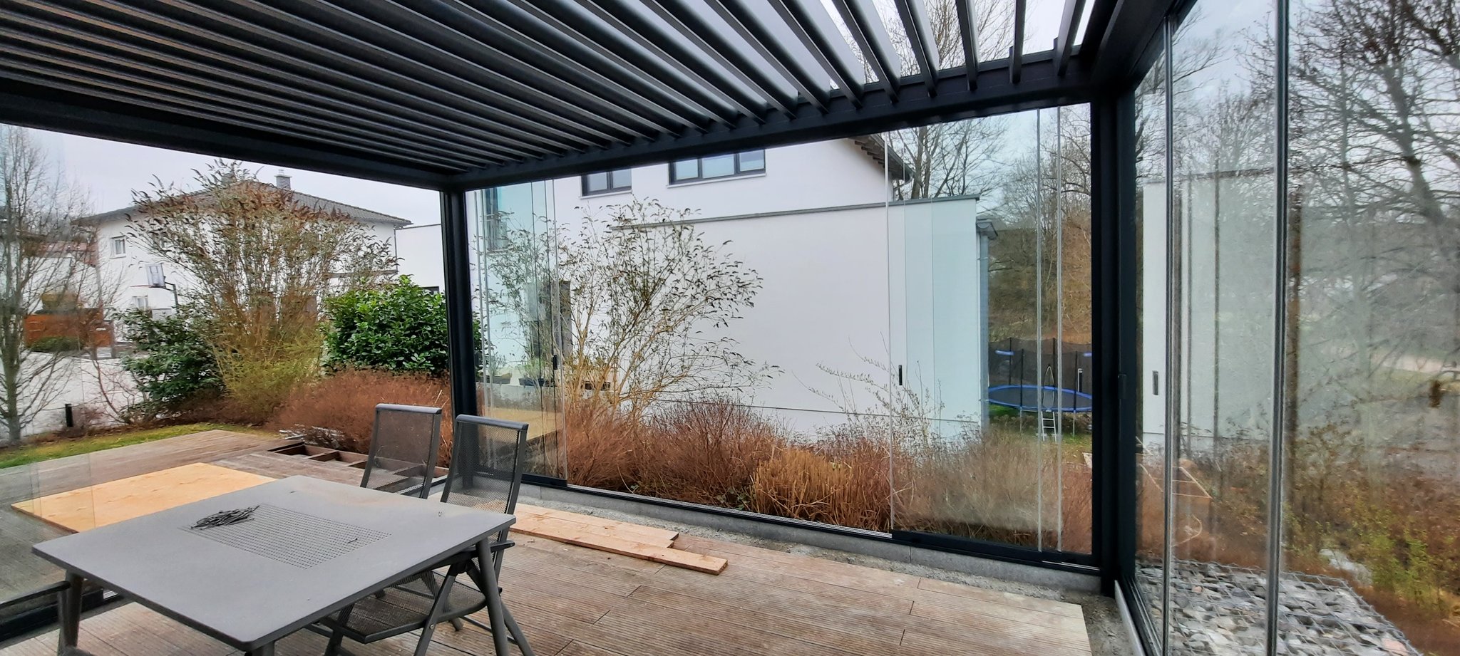 Dieses 5,12m x 4m große Lamellendach wurde zusätzlich mit Glasschiebewänden von Weinor ausgestattet. So entsteht ein Kaltwintergarten, der das ganze Jahr über flexibel genutzt werden kann.
