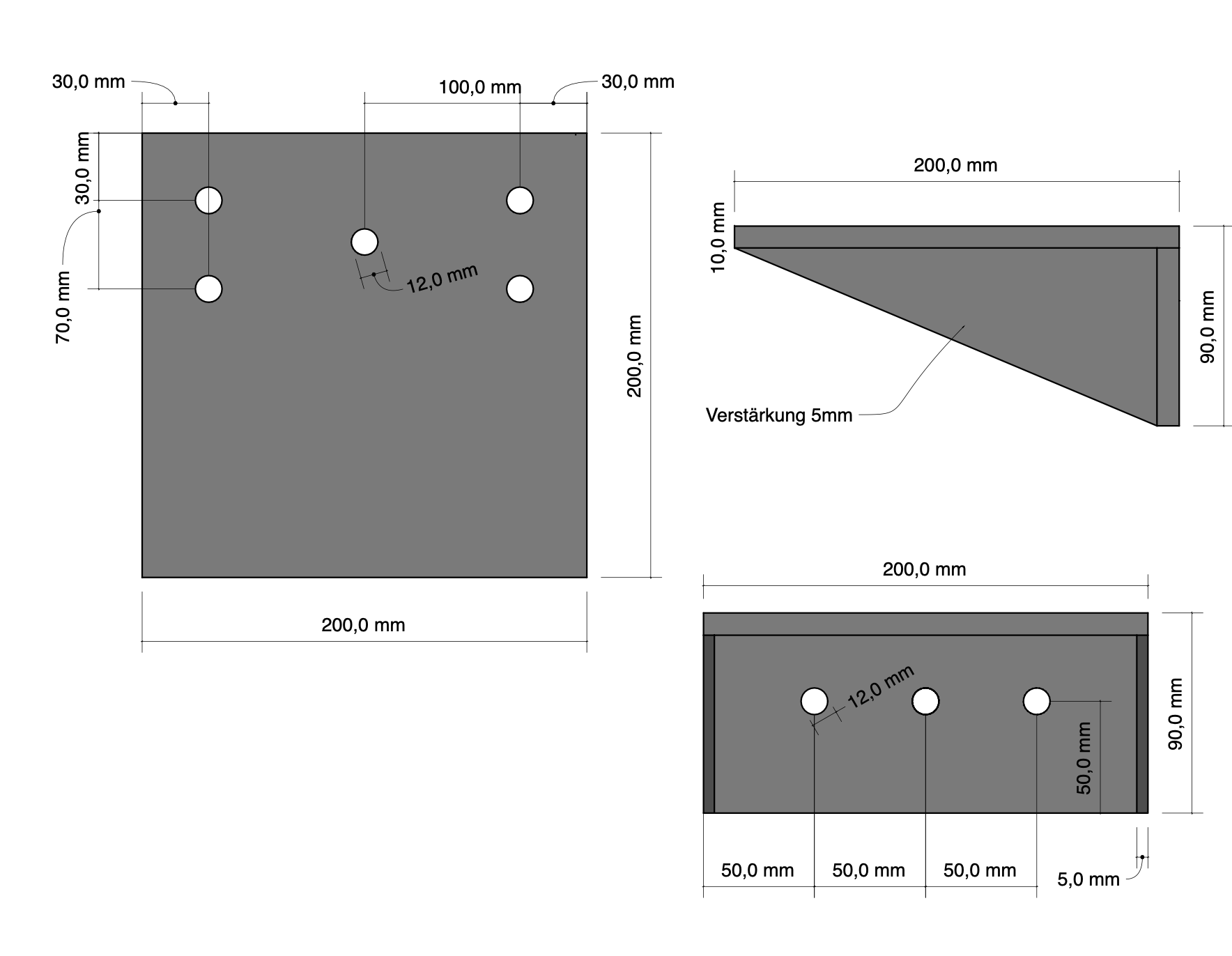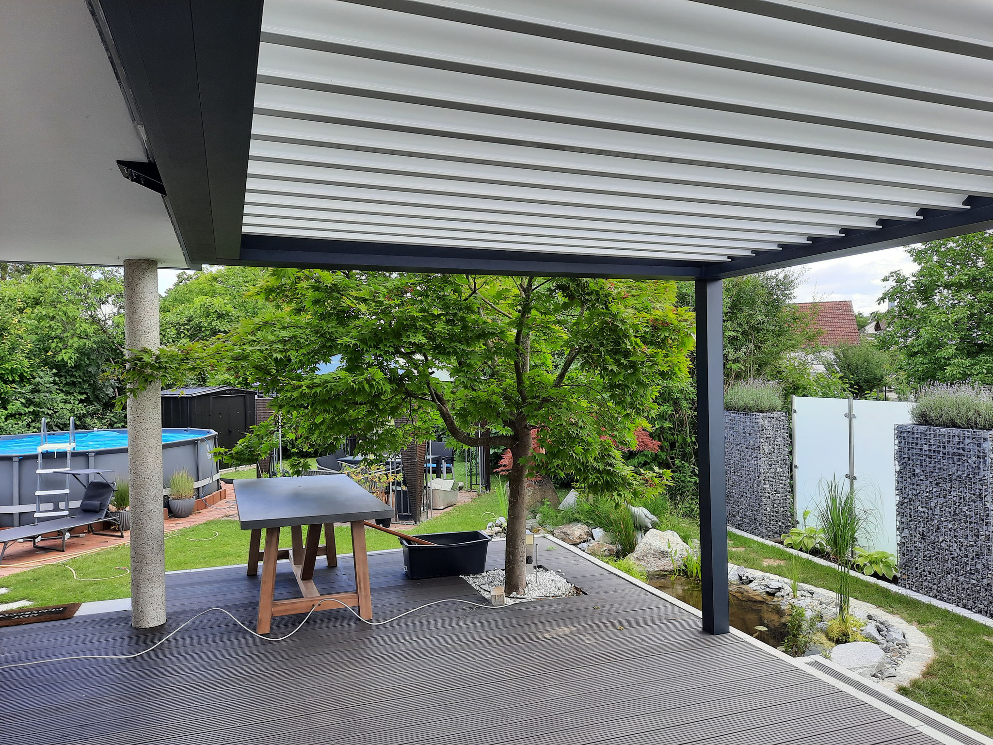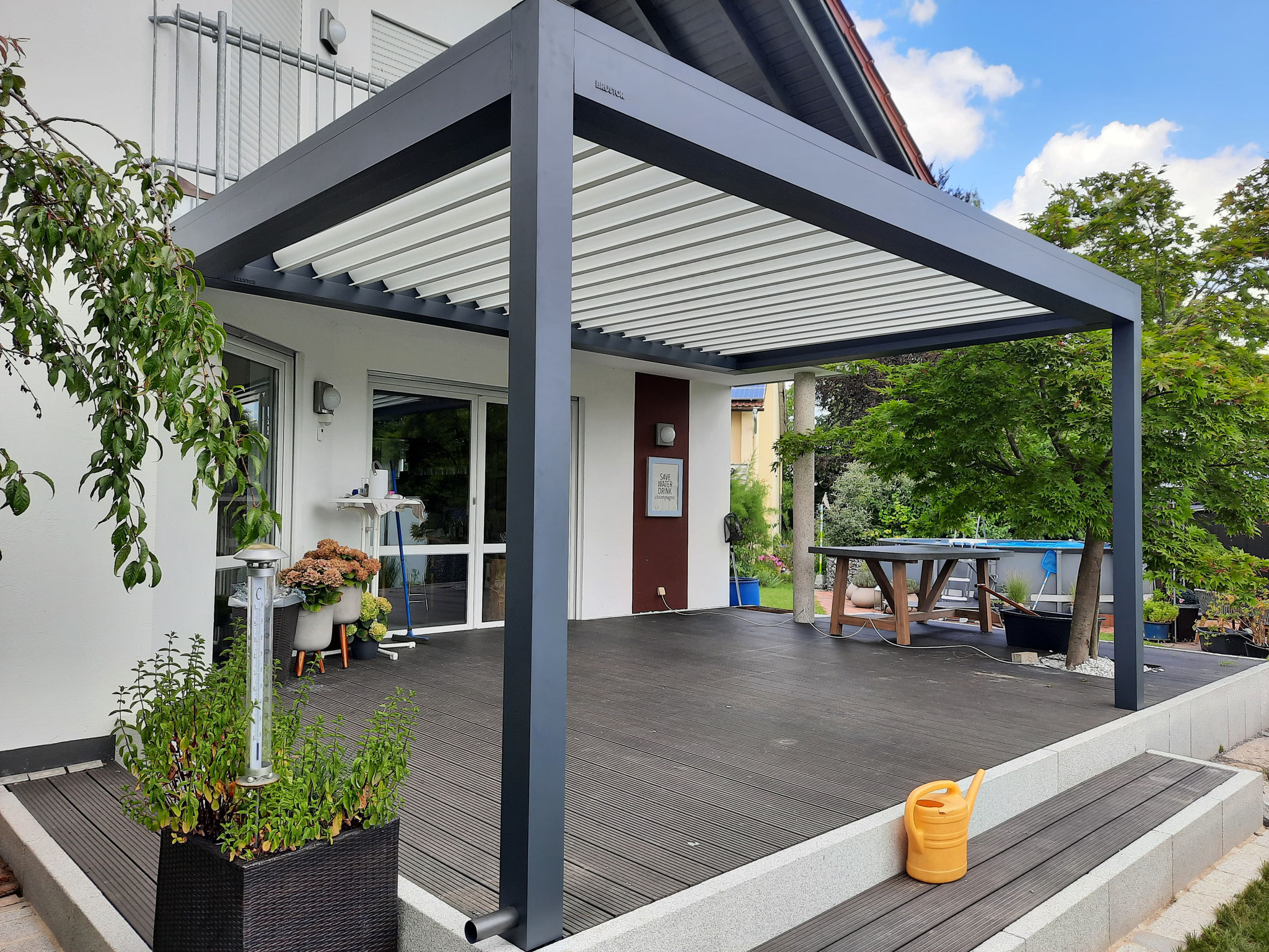 Bei diesem Kunden konnten wir die Terrassenüberdachung nicht direkt vorne am Balkon befestigen. Daher haben wir eigens dafür Konsolen geplant und anfertigen lassen, um das Terrassendach von