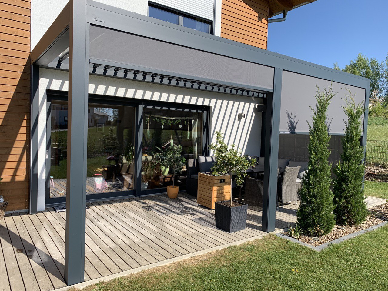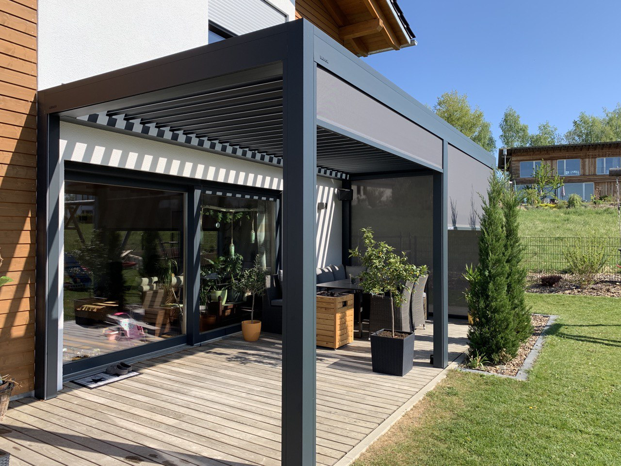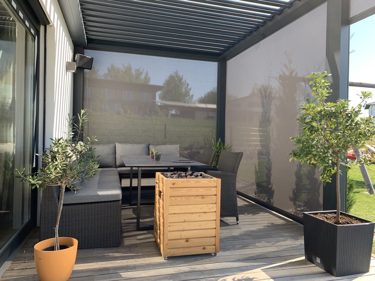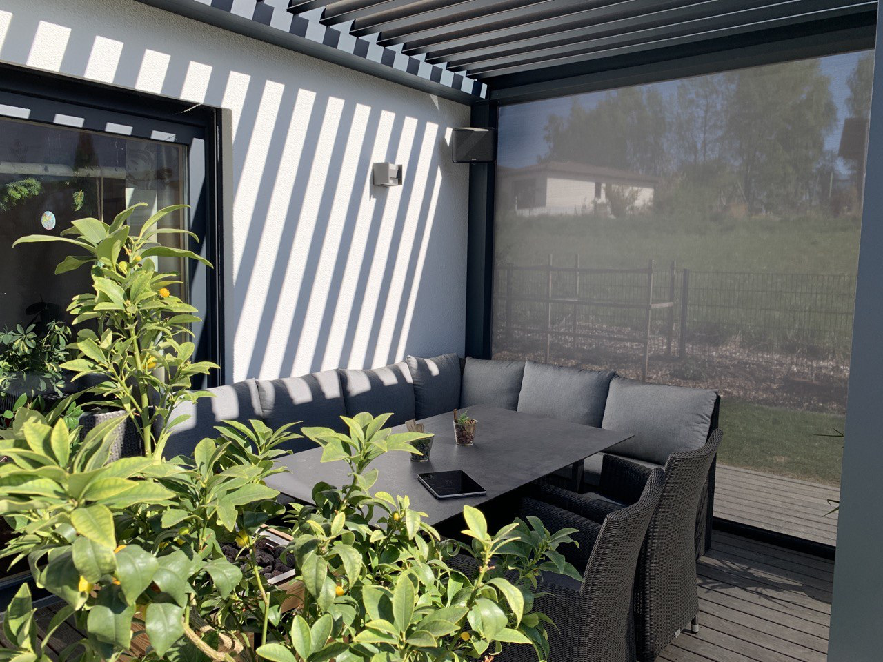 Ein zusätzliche Türpfosten unterteilt die lange Seite, sodass die integrierten Zip-Screens unabhängig voneinander gesteuert werden können. Auch bei geschlossenen Lamellen & Screens ist es