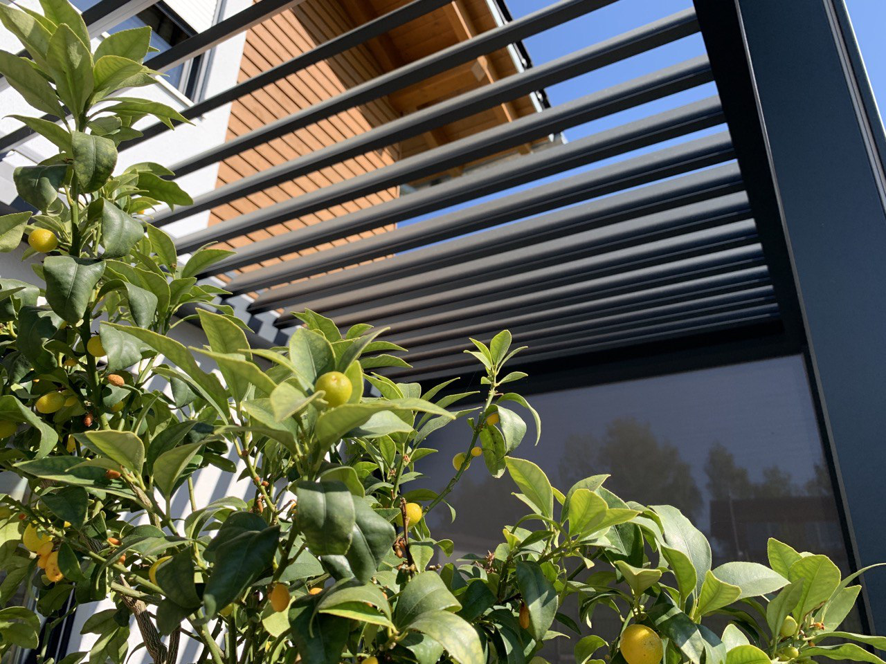 Dieses Terrassendach zeigt, dass auch schmalere Terrassen geeignet für Lamellendächer sind. Diese Überdachung hat eine Größe von 2,93m x 6,23m.