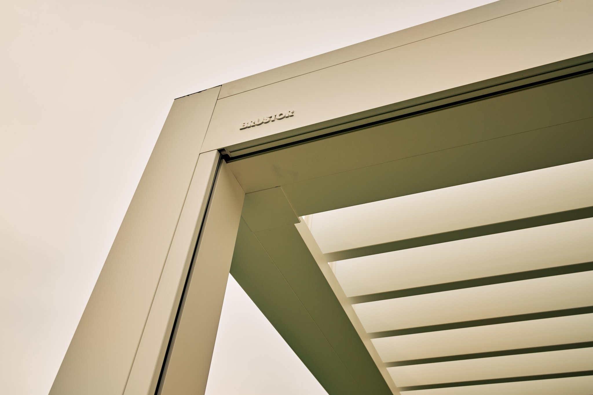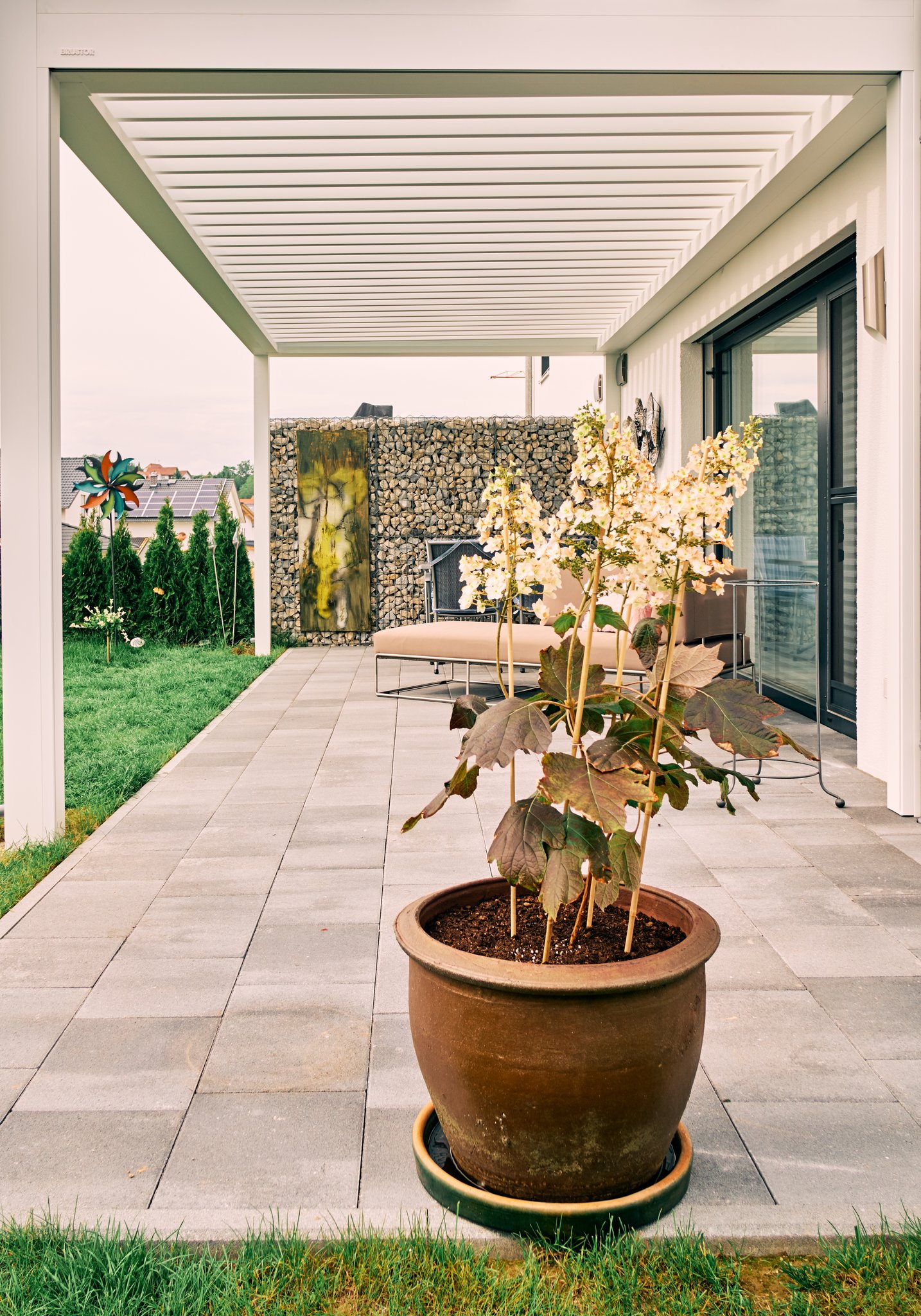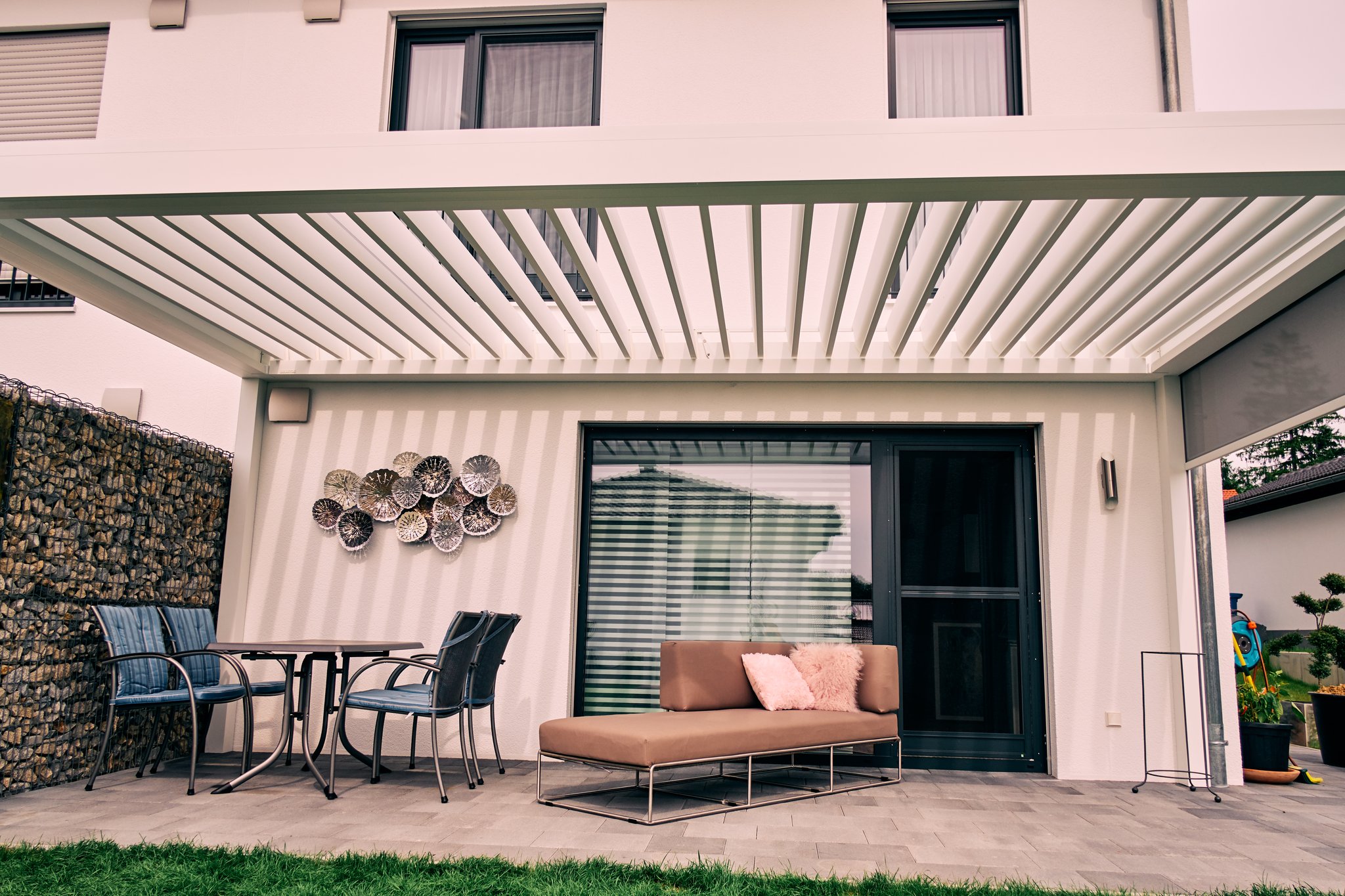 Diese Terrassenüberdachung in weiß mit 4m x 6m wurde mit LED-Beleuchtung und integrierten Screens ausgestattet.