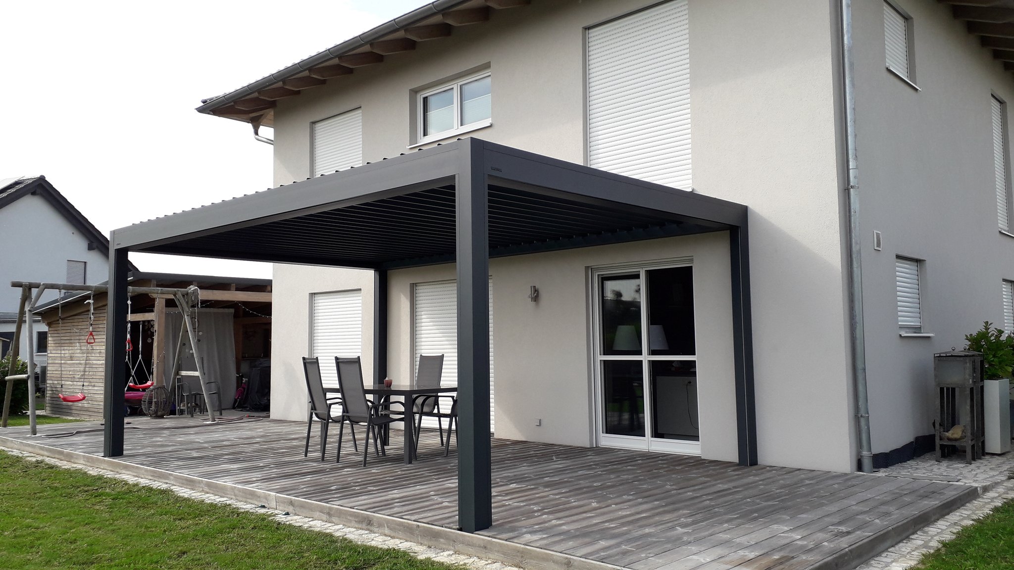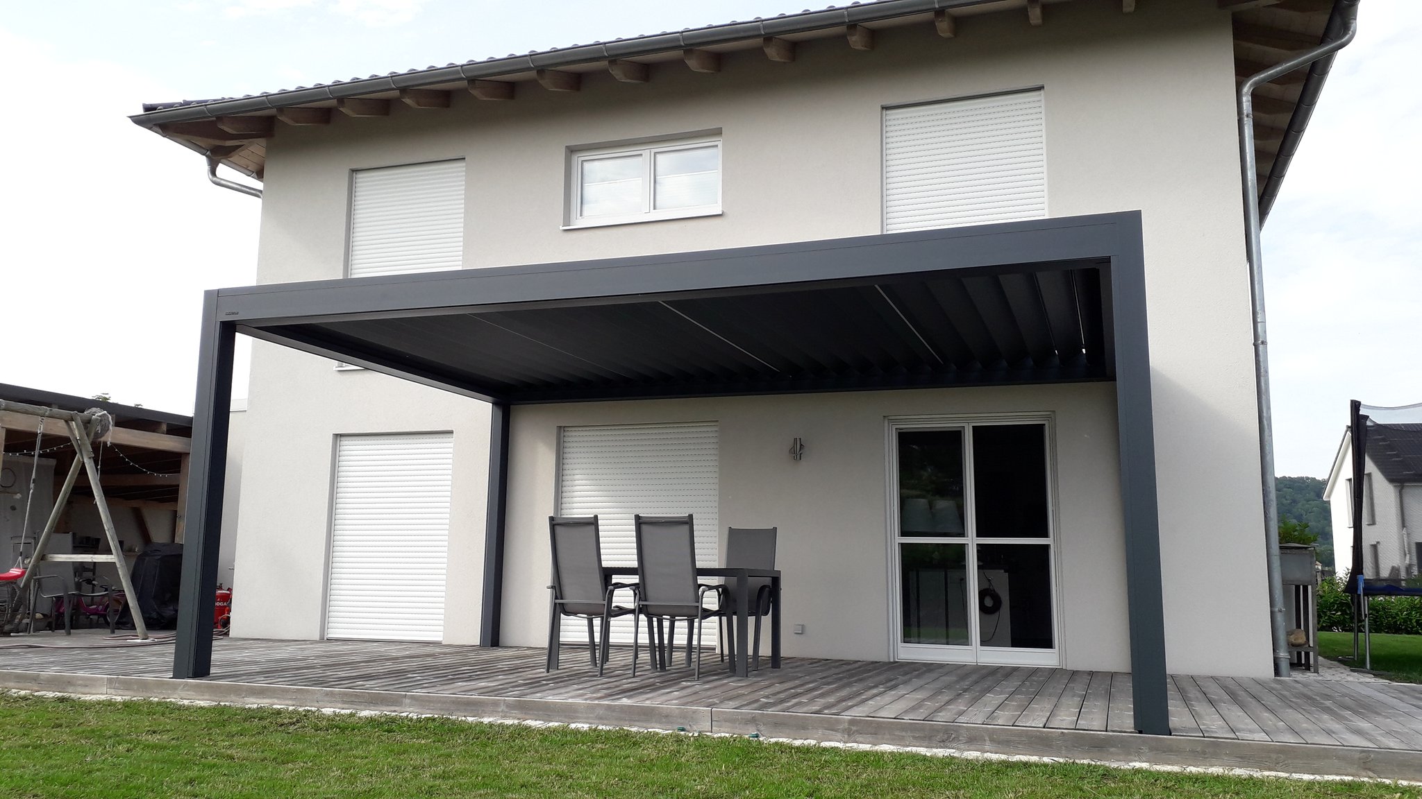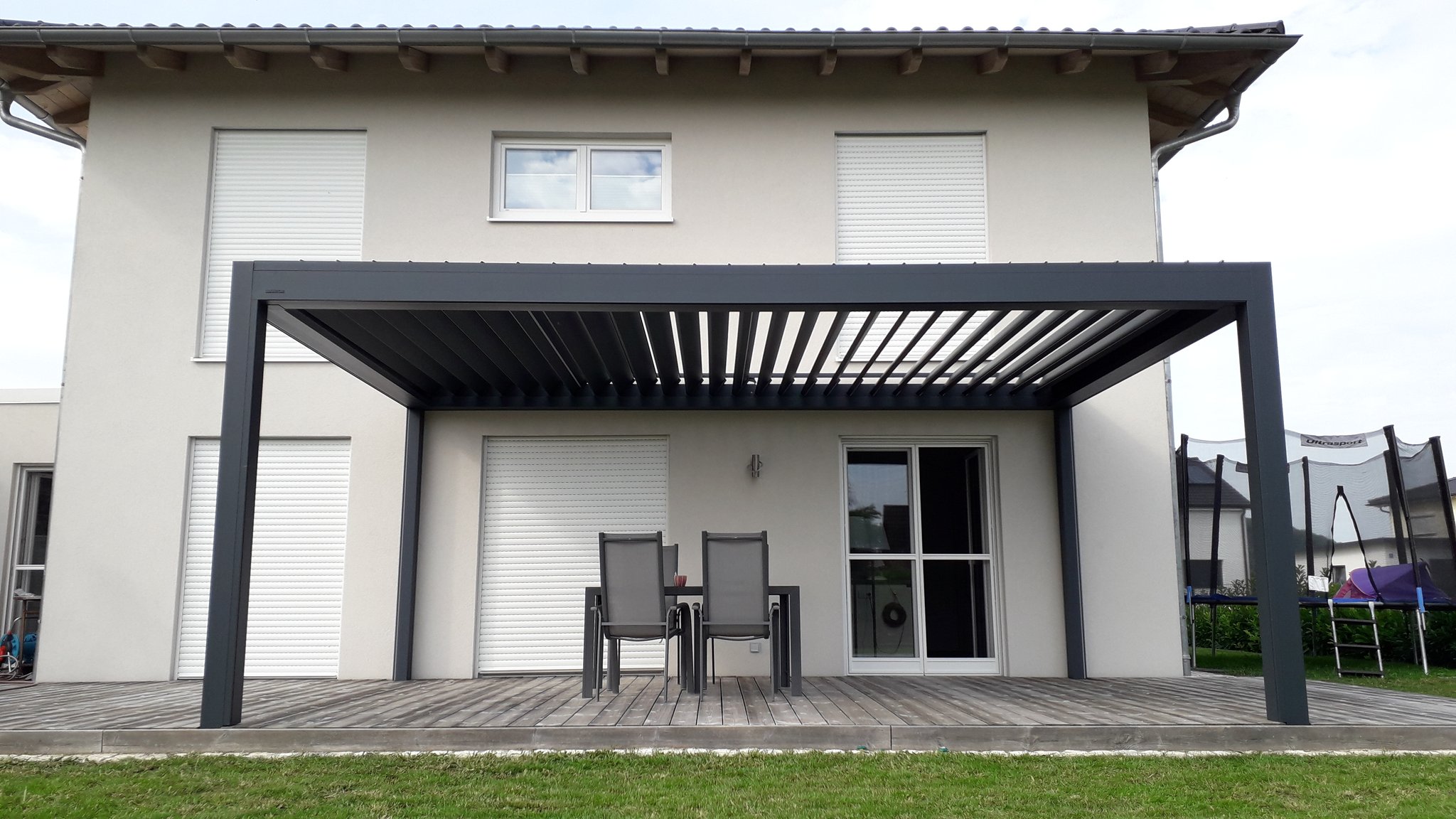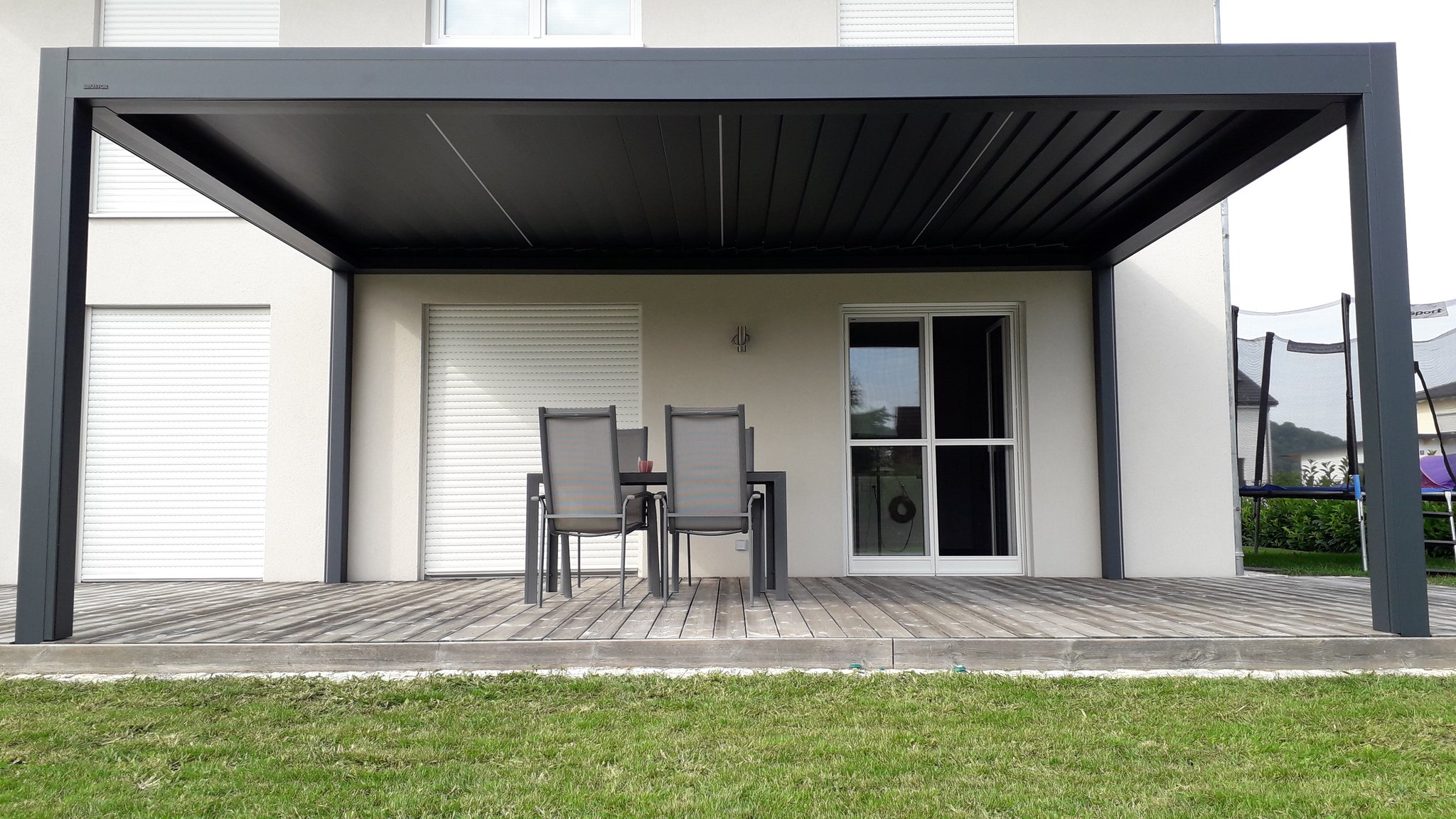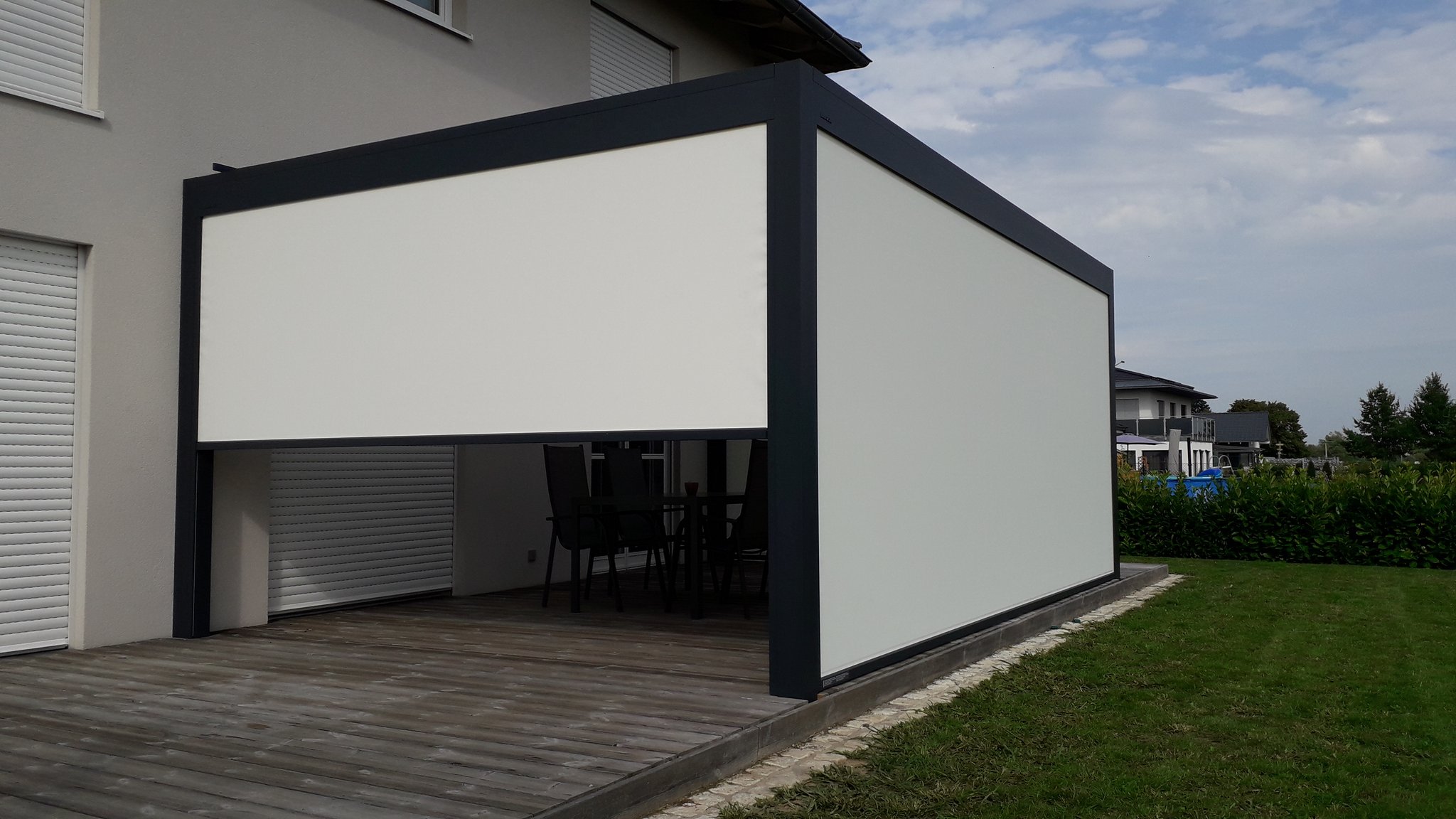 Dieses Terrassendach der Marke Brustor misst 6m x 3,96m. Ausgestattet ist es mit hellen Zip-Screens und einer LED-Beleuchtung in de Lamellen.
