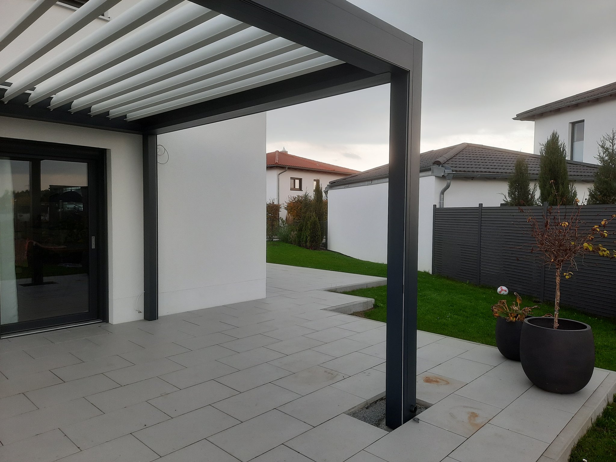 Die Kombination von dunklem Rahmen mit weißen Lamellen sorgt hier für ein tolles Raumgefühl in der Terrassenüberdachung. Zusätzliche Wohnlichkeit wird durch die LED-Beleuchtung in den Lamellen