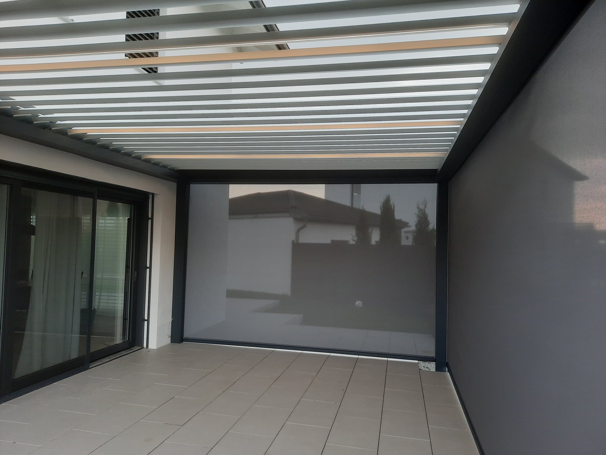 Die beiden integrierten Zip Screens schützen vor Wind und beschatten den Terrassenbereich zusätzlich.