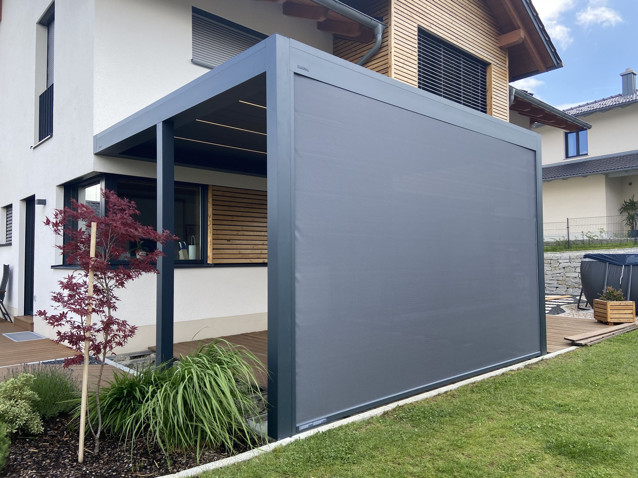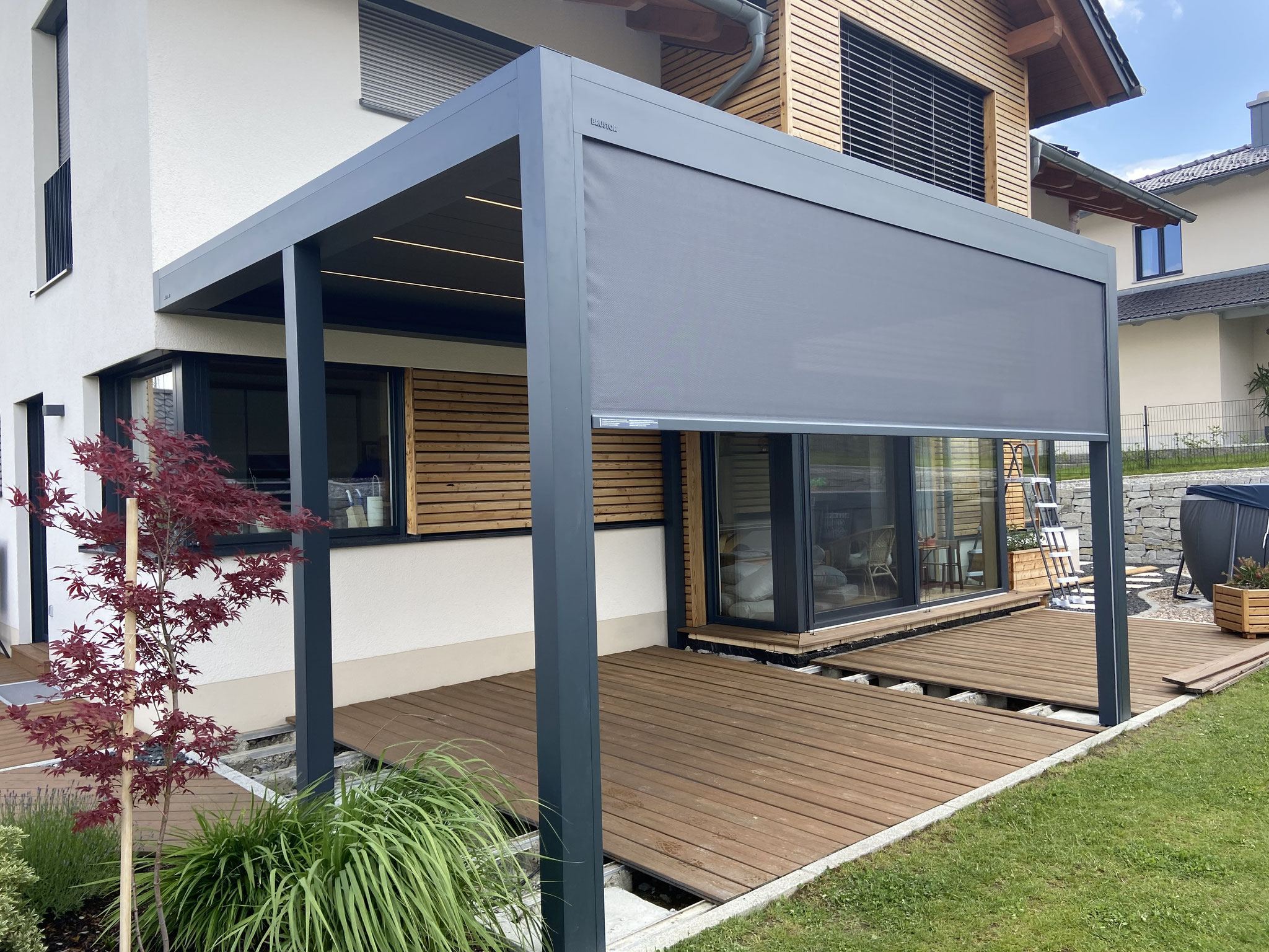 Hier zeigen wir vorher-nachher Bilder von einem Brustor-Lamellendach. Auf der linken Seite wurde ein zusätzlicher Pfosten montiert. So bleibt der Zugang zur Terrasse frei und man kann seitlich trotzdem ein Screen montieren. LED-Beleuchtung in der Lamelle, sowie ein Screen auf der Südseite wurden ebenfalls bestellt.