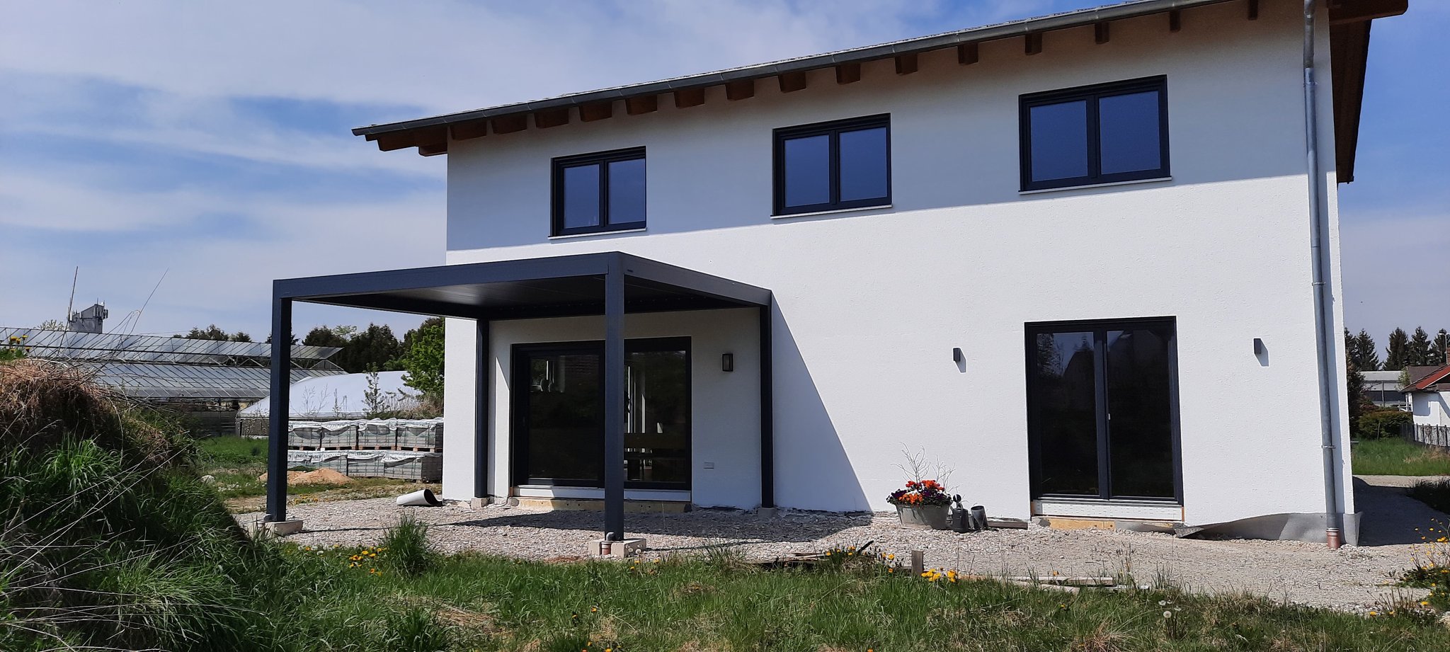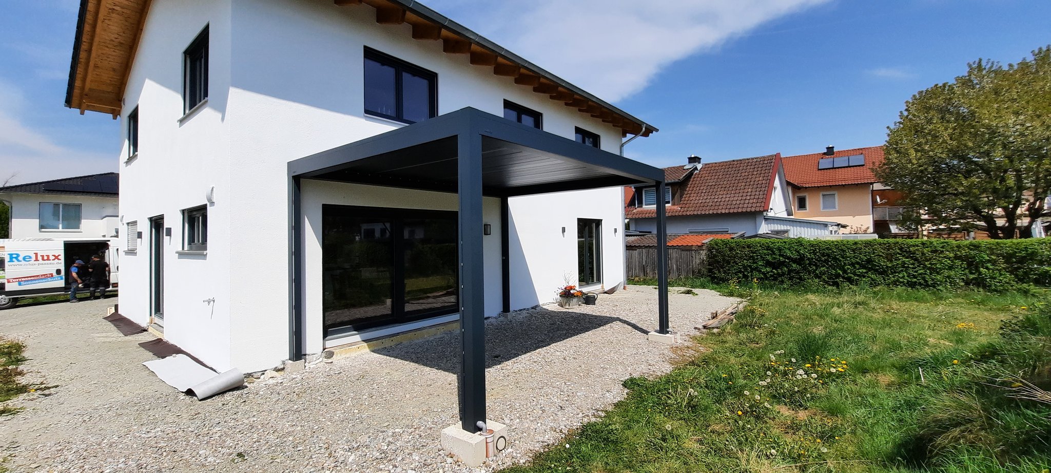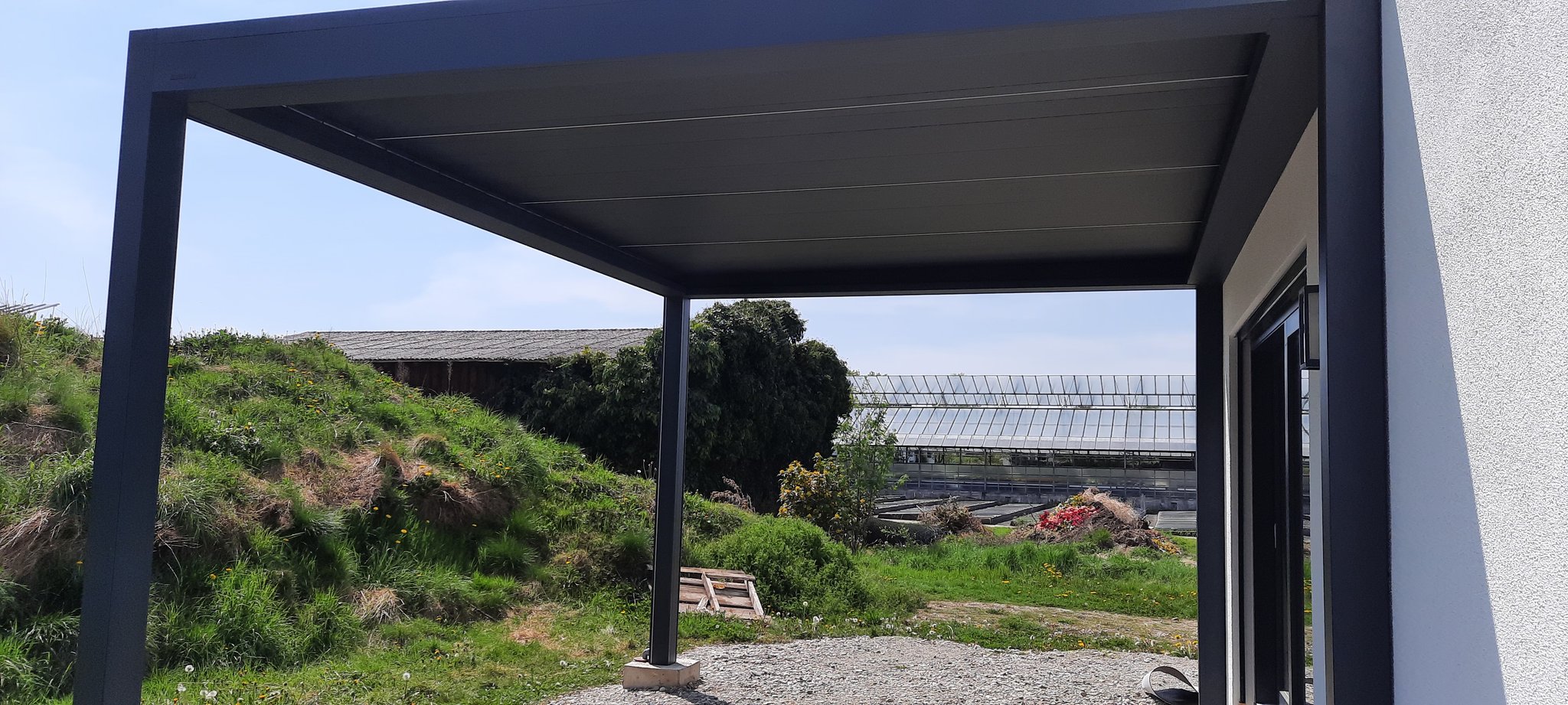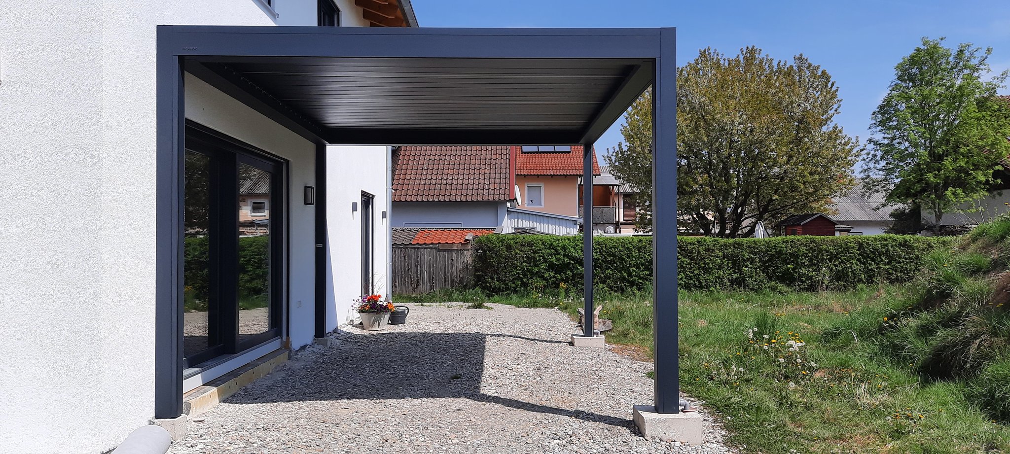 Dieses Terrassendach der Marke Brustor verfügt über zwei integrierte Screens, sowie einer LED Beleuchtung in den Lamellen.