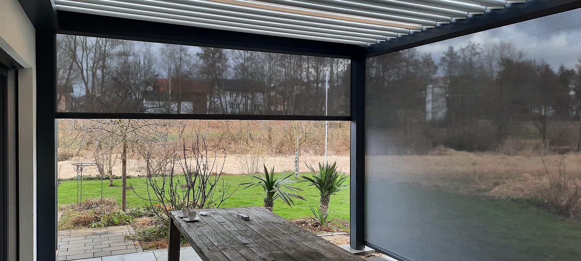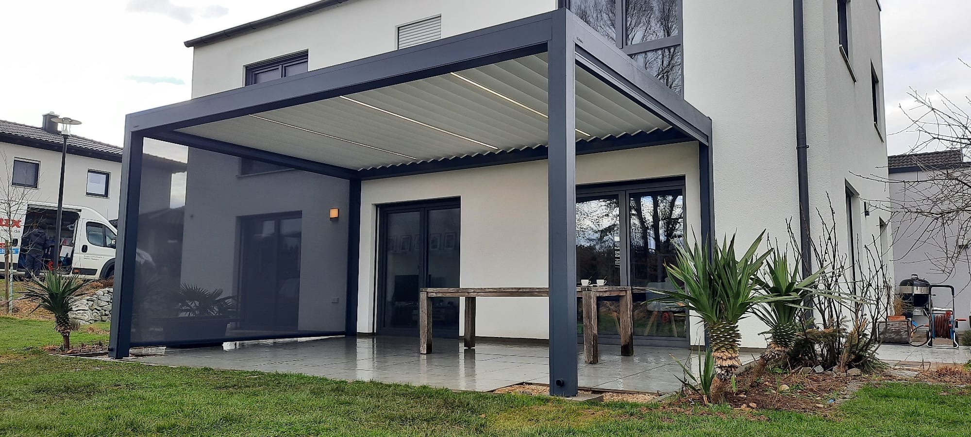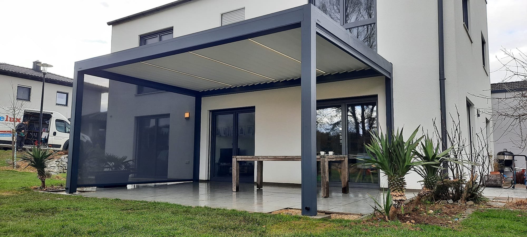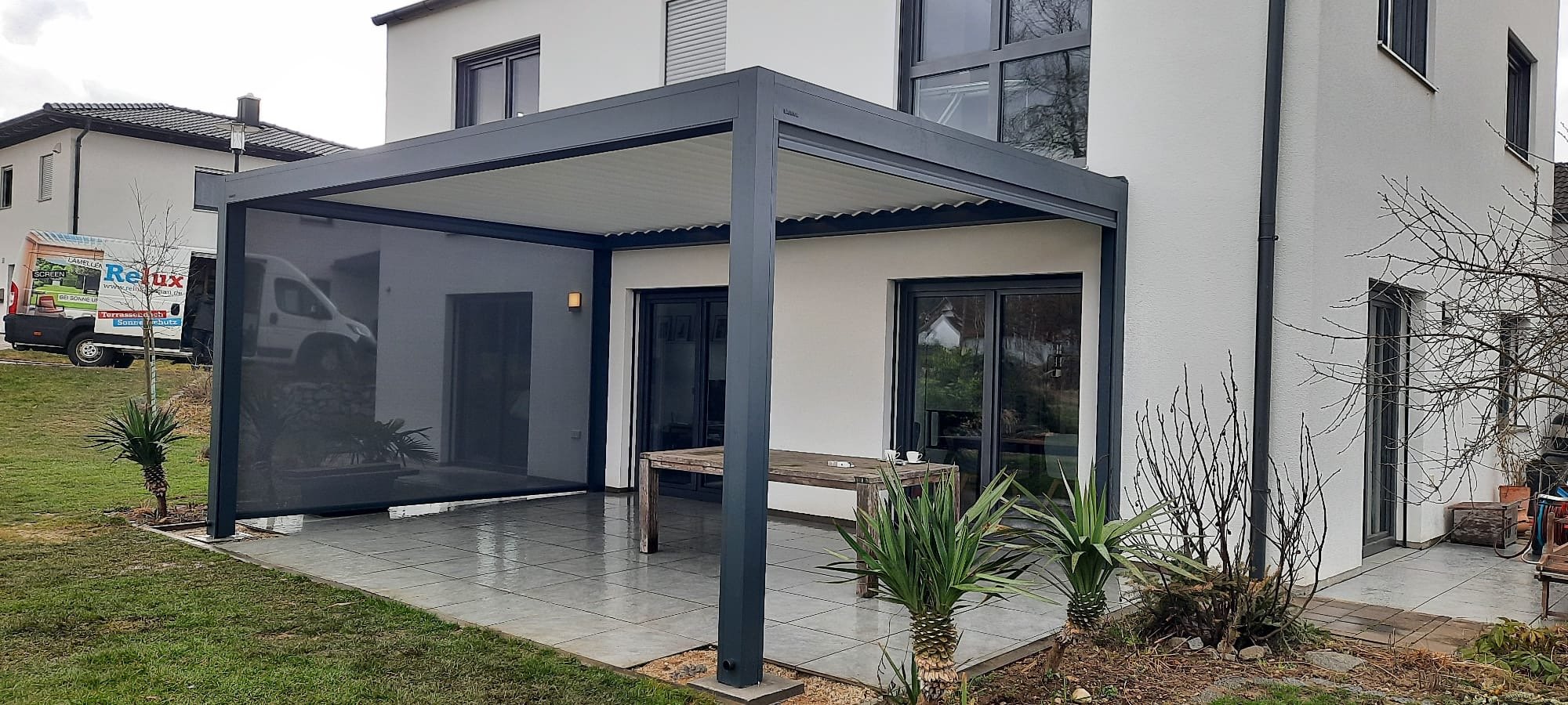 Dieses Terrassendach ist mit integrierten Screens an drei Seiten, sowie einer LED Beleuchtung in den Lamellen ausgestattet.