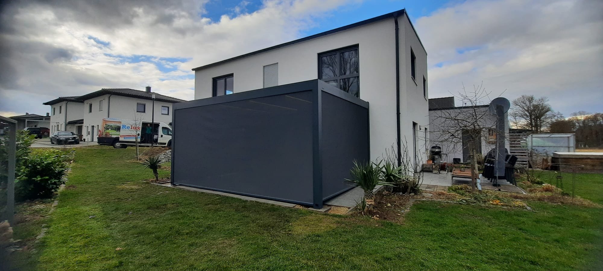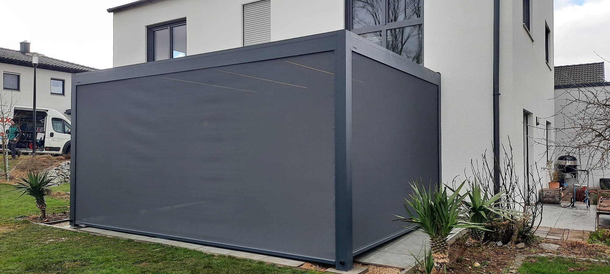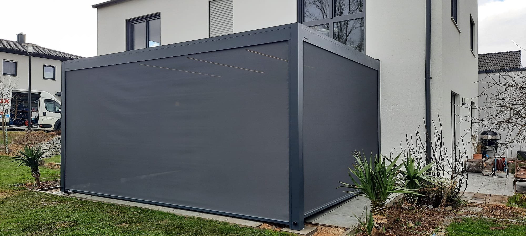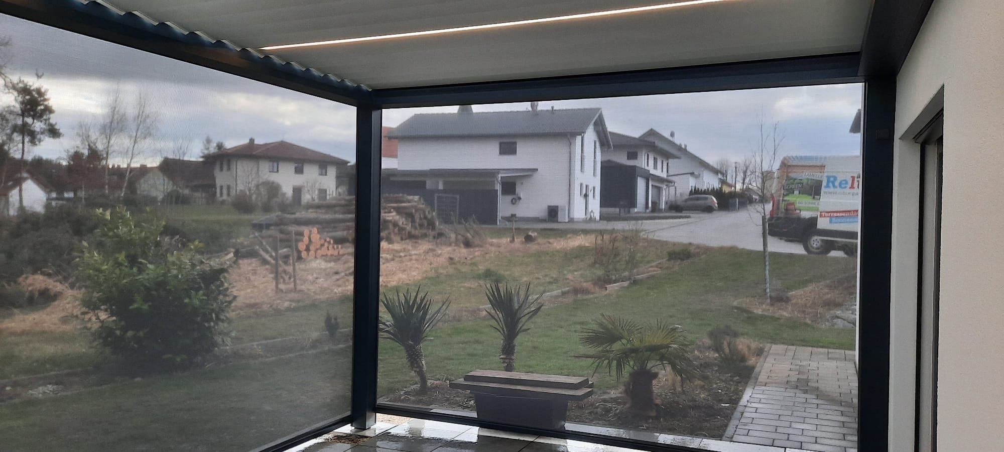 Dieses Terrassendach ist mit integrierten Screens an drei Seiten, sowie einer LED Beleuchtung in den Lamellen ausgestattet.