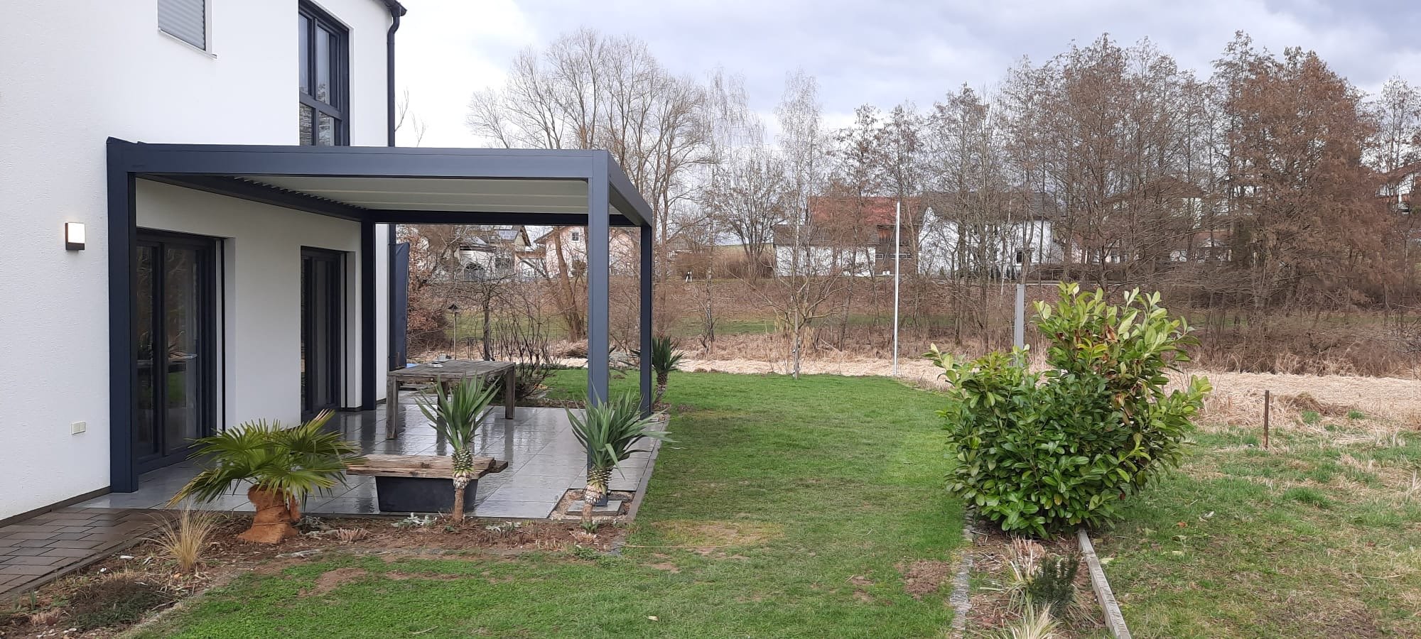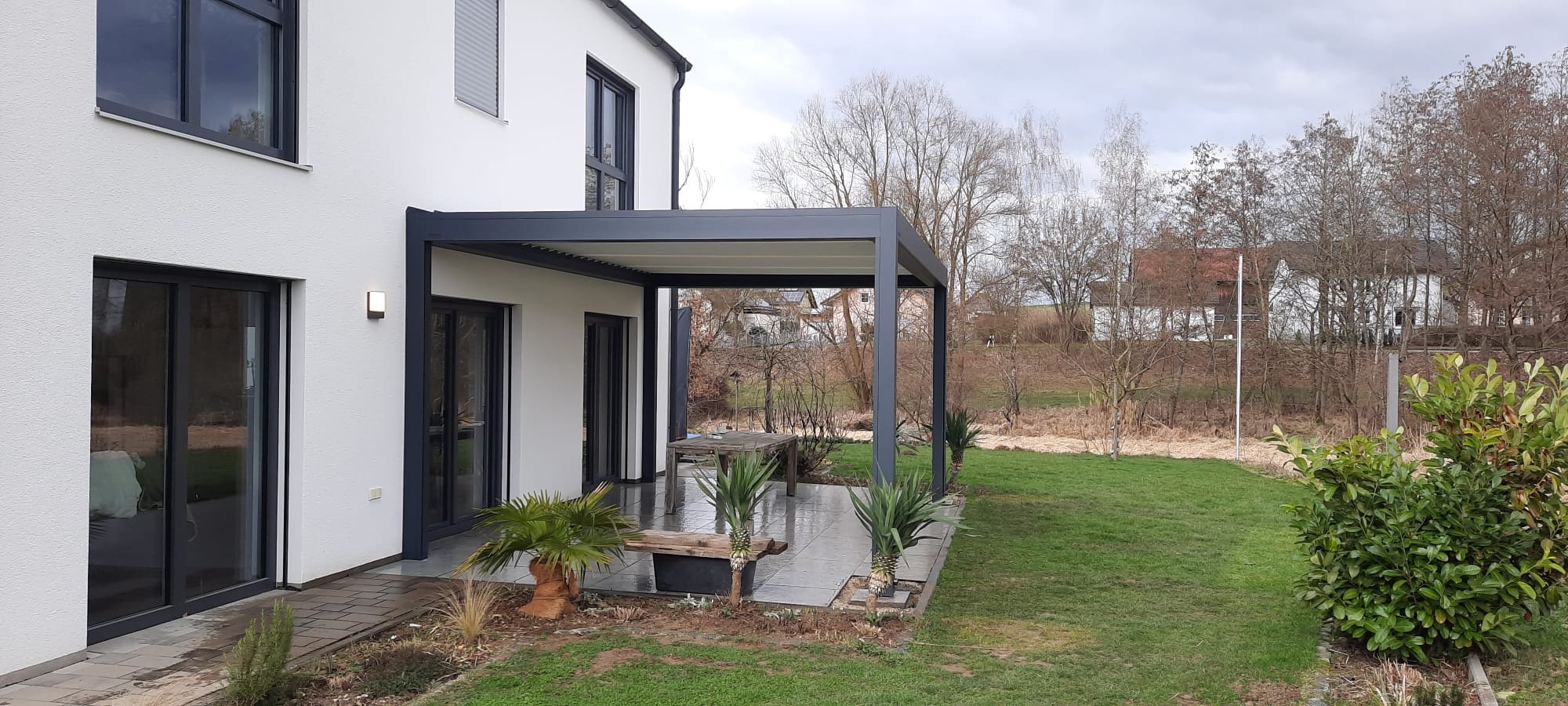 Die Kombination von heller Lamelle und dunklem Rahmen passt sich hier perfekt dem Stil des Hauses an.