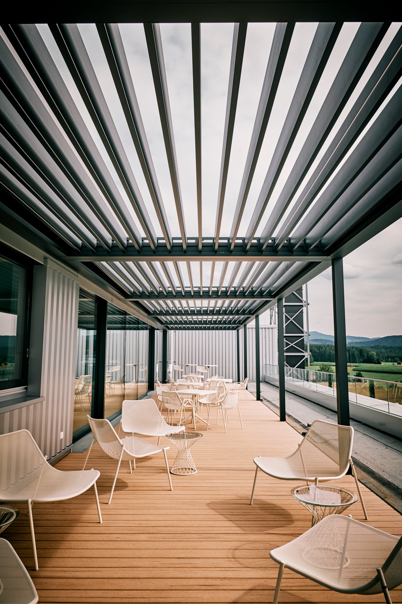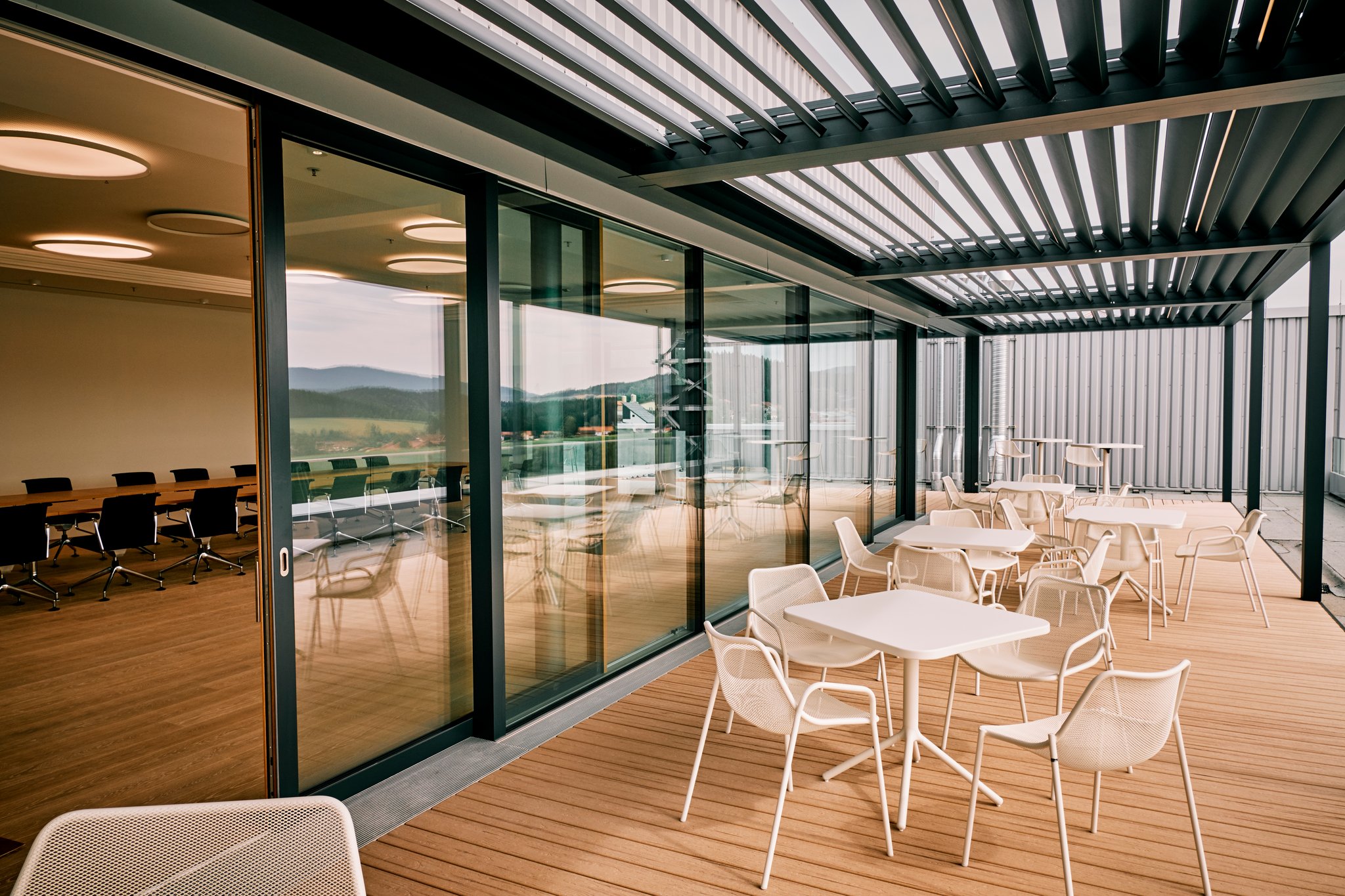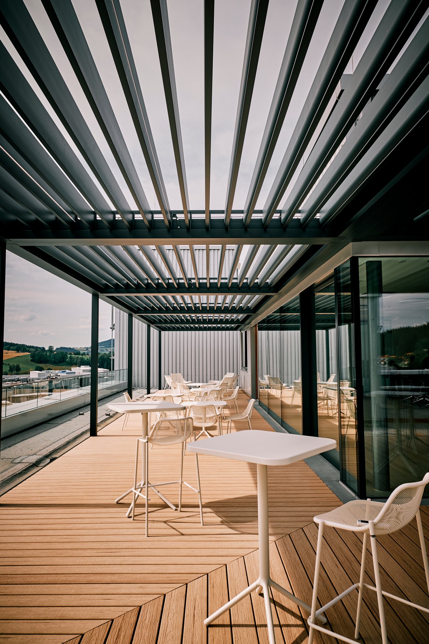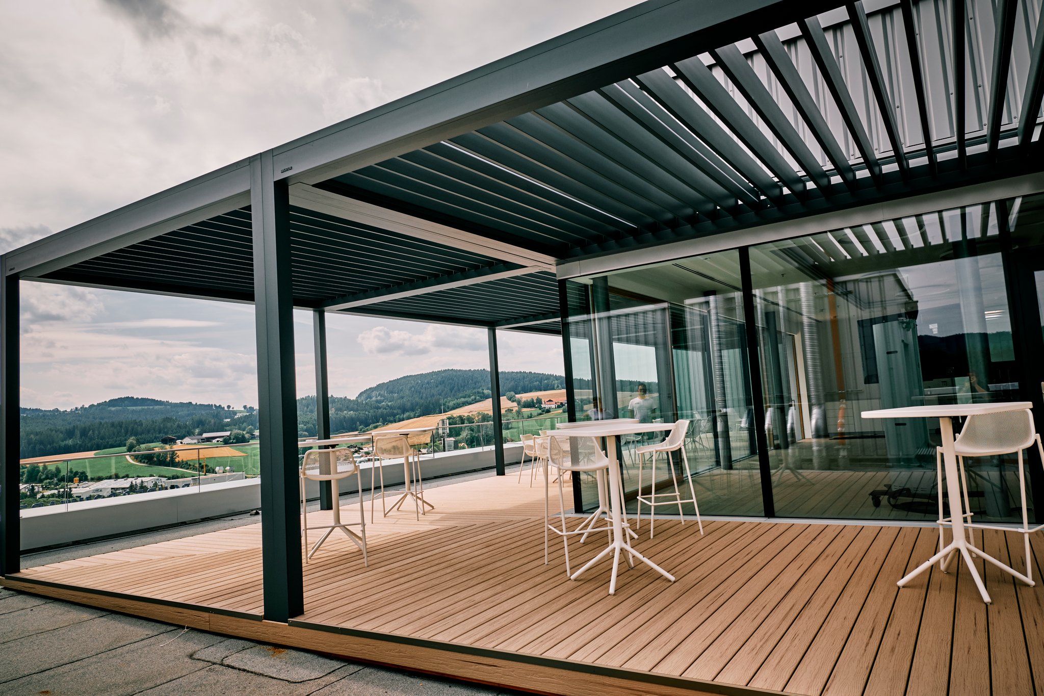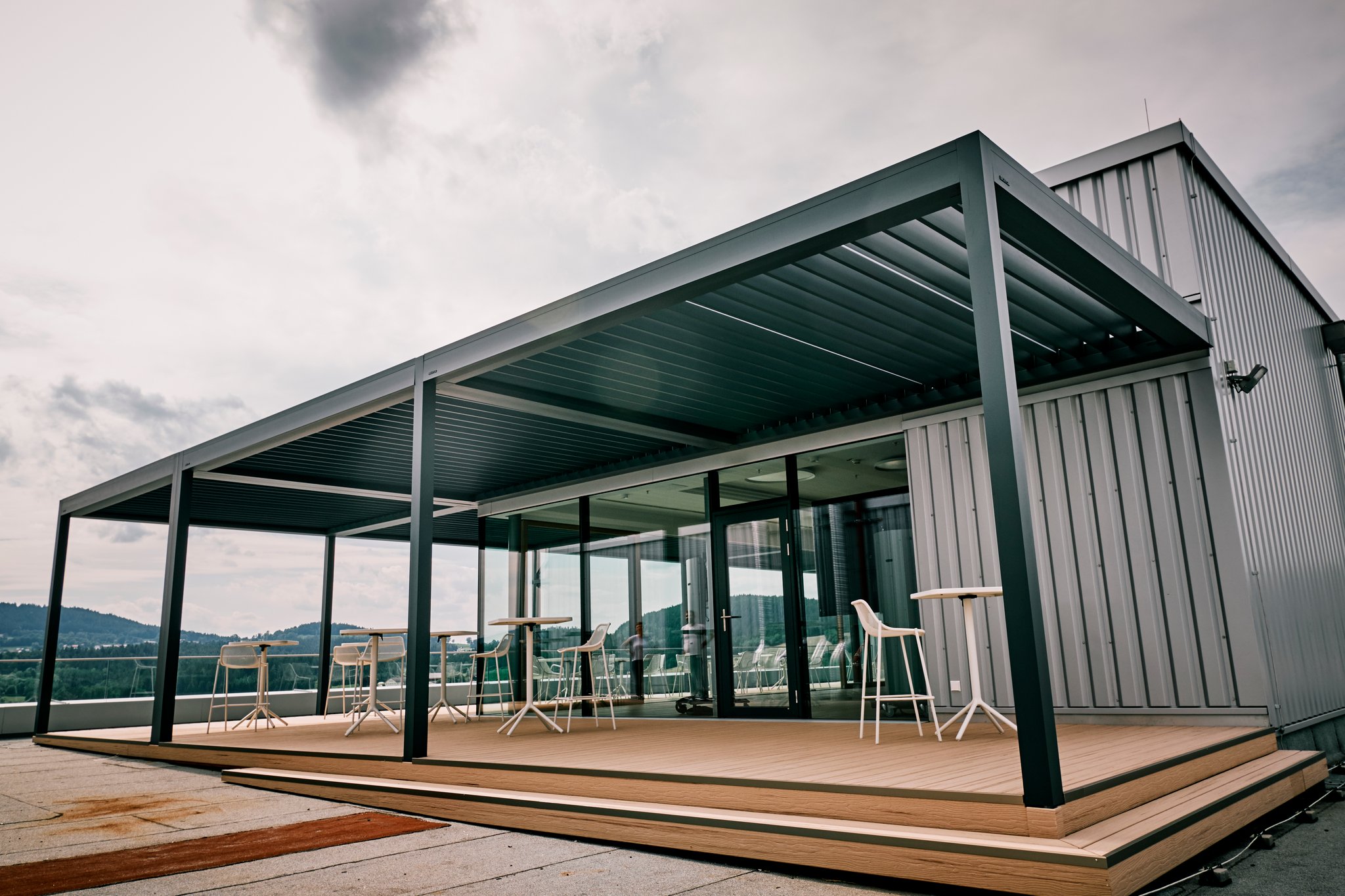 Bei diesem Gewerbekunden haben wir sieben gekoppelte Lamellendächer von Brustor installiert. Jedes Dachfeld hat eine integrierte LED-Beleuchtung in den Lamellen und ist separat steuerbar. Die Überdachungen dienen als Erweiterung des Besprechungsraumes und ersetzen zusätzlich den klassischen Fenstersonnenschutz. Durch den flexiblem Einstellwinkel der Lamellen kann man den Lichteinfall wunderbar steuern.