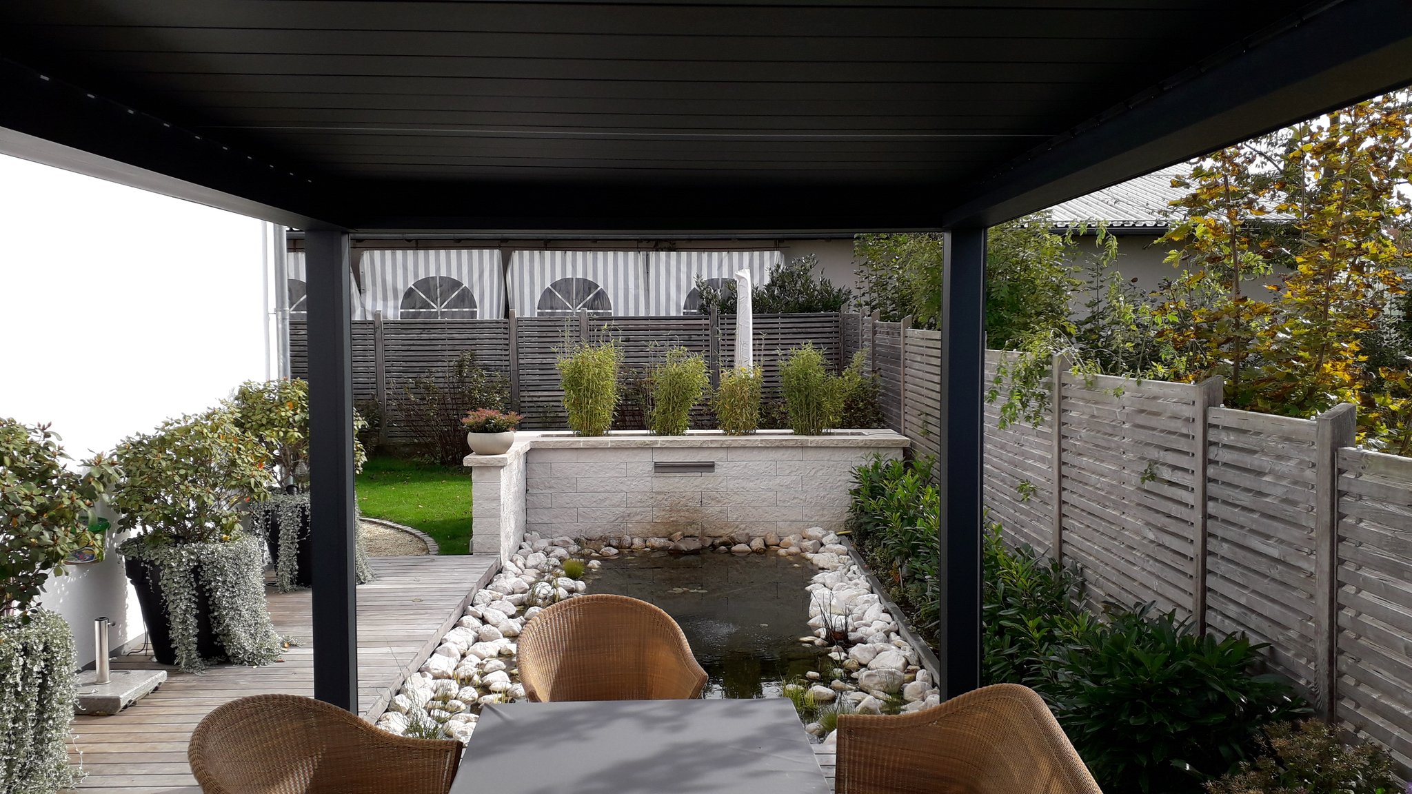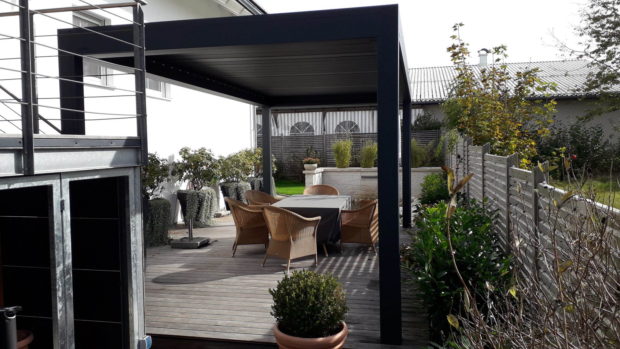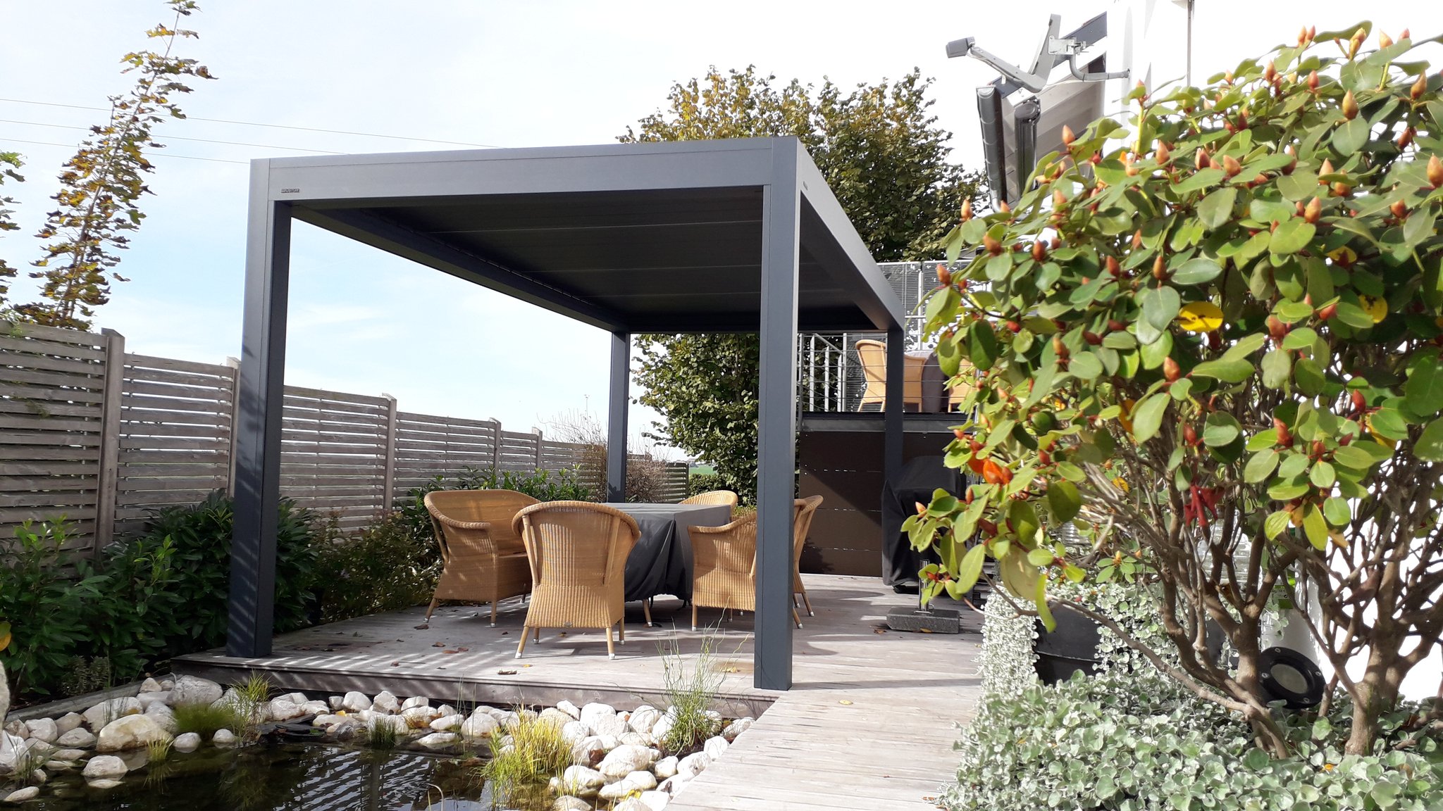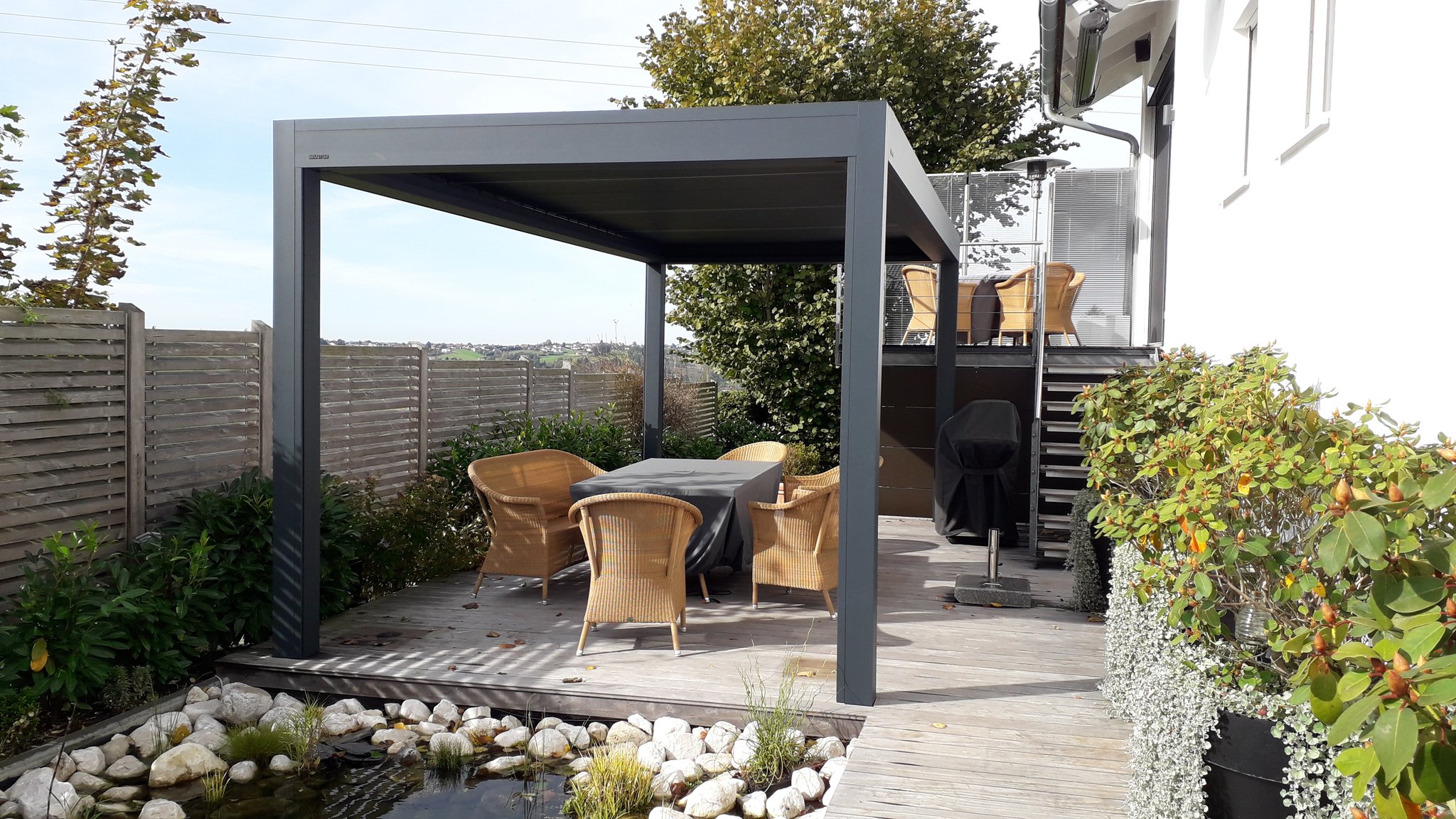 Dieses freistehende Lamellendach passt sich ideal in den vorhanden Platz im Garten ein. Ausgestattet ist es mit drei integrierten Zip-Screens und LED-Beleuchtung in den Lamellen.