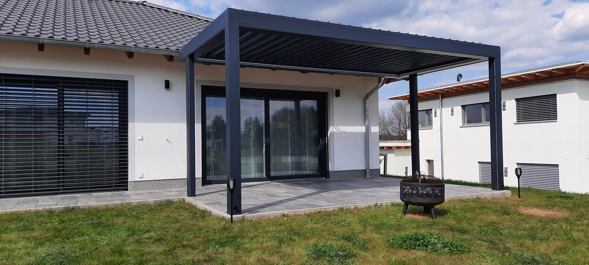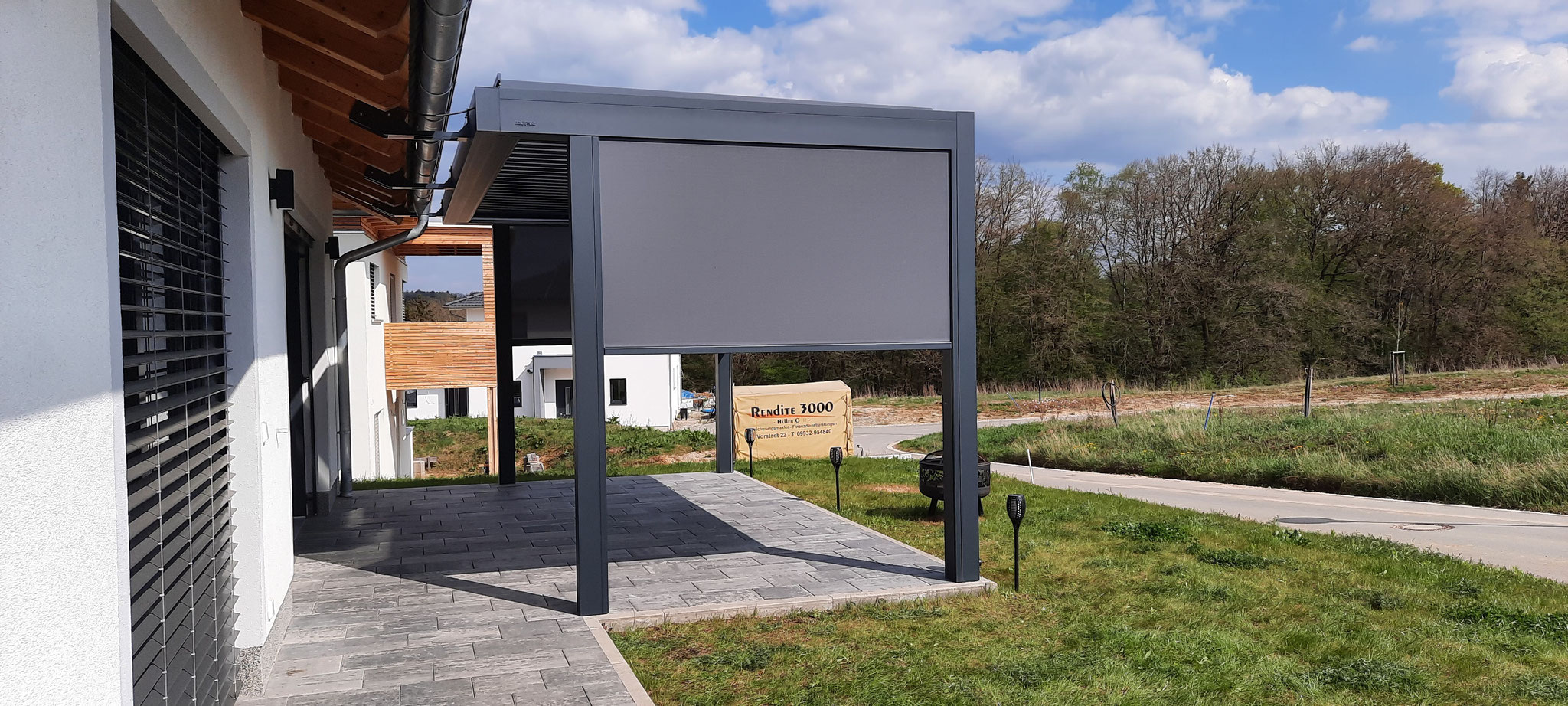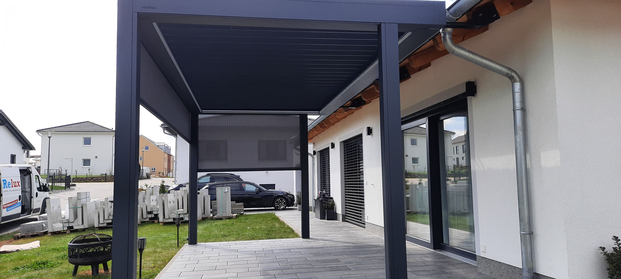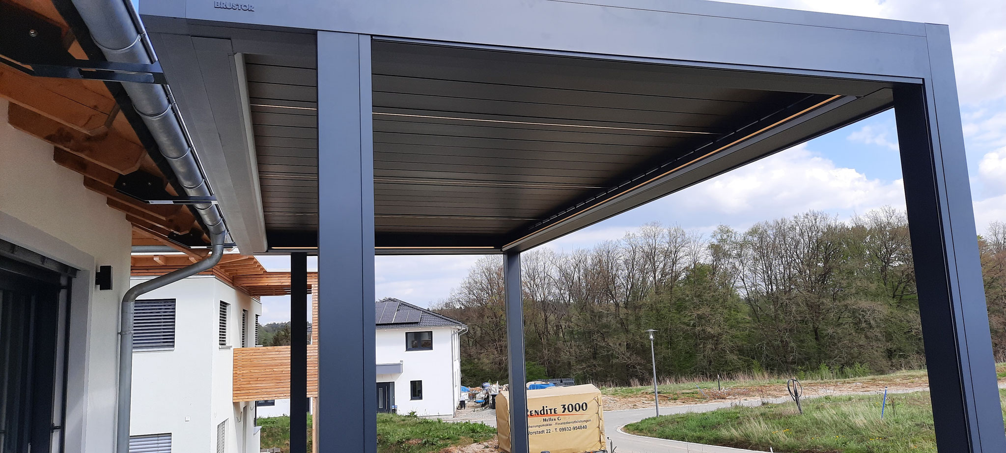 Die Befestigung stellte bei diesem Kunden eine besondere Herausforderung dar. Dank unserer individuellen Planung haben wir spezielle Konsolen entworfen und hergestellt. Dadurch konnte das Lamellendach sicher am Haus befestigt werden, und der Spalt zur Regenrinne wurde nachträglich verblecht.