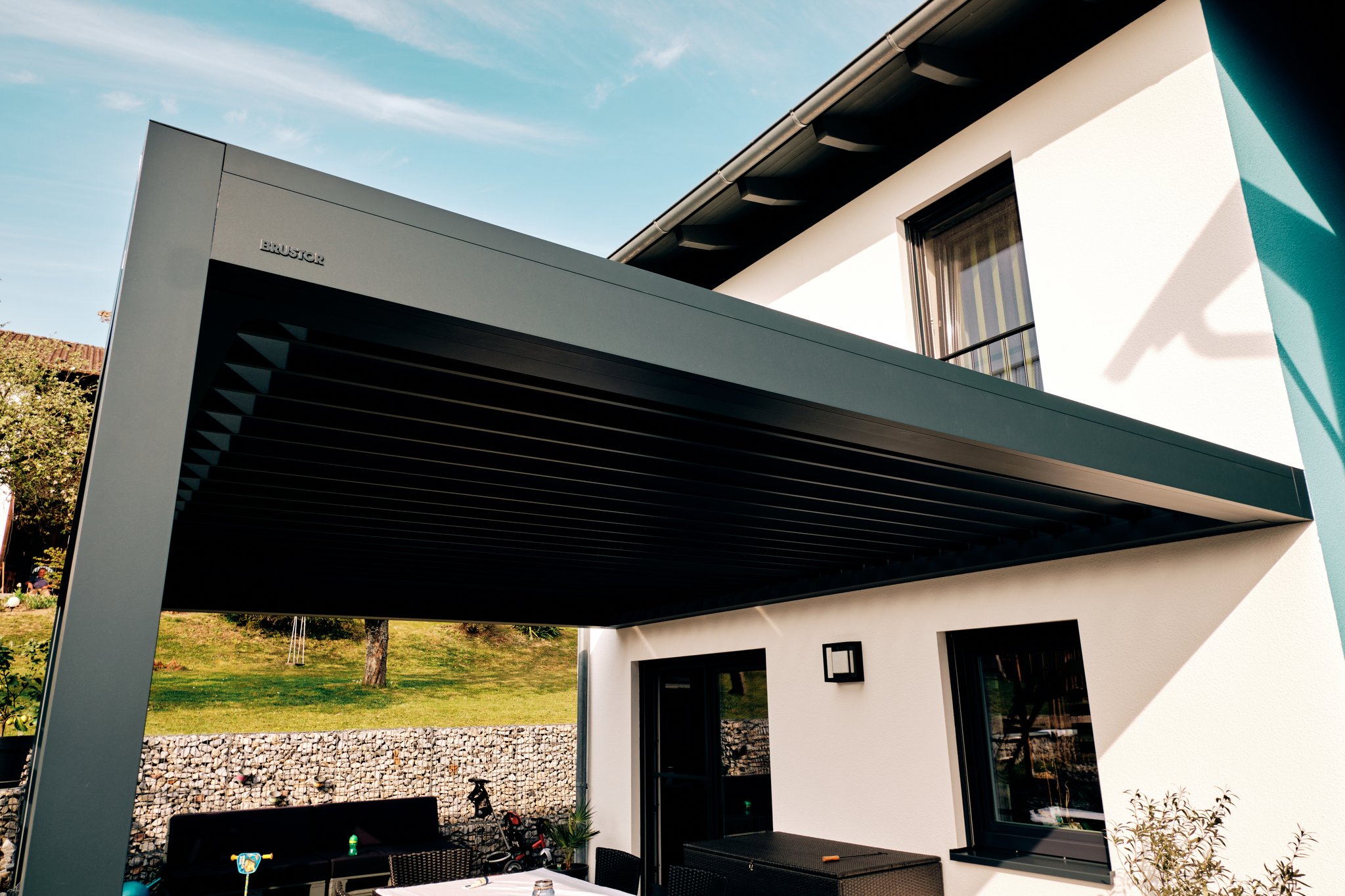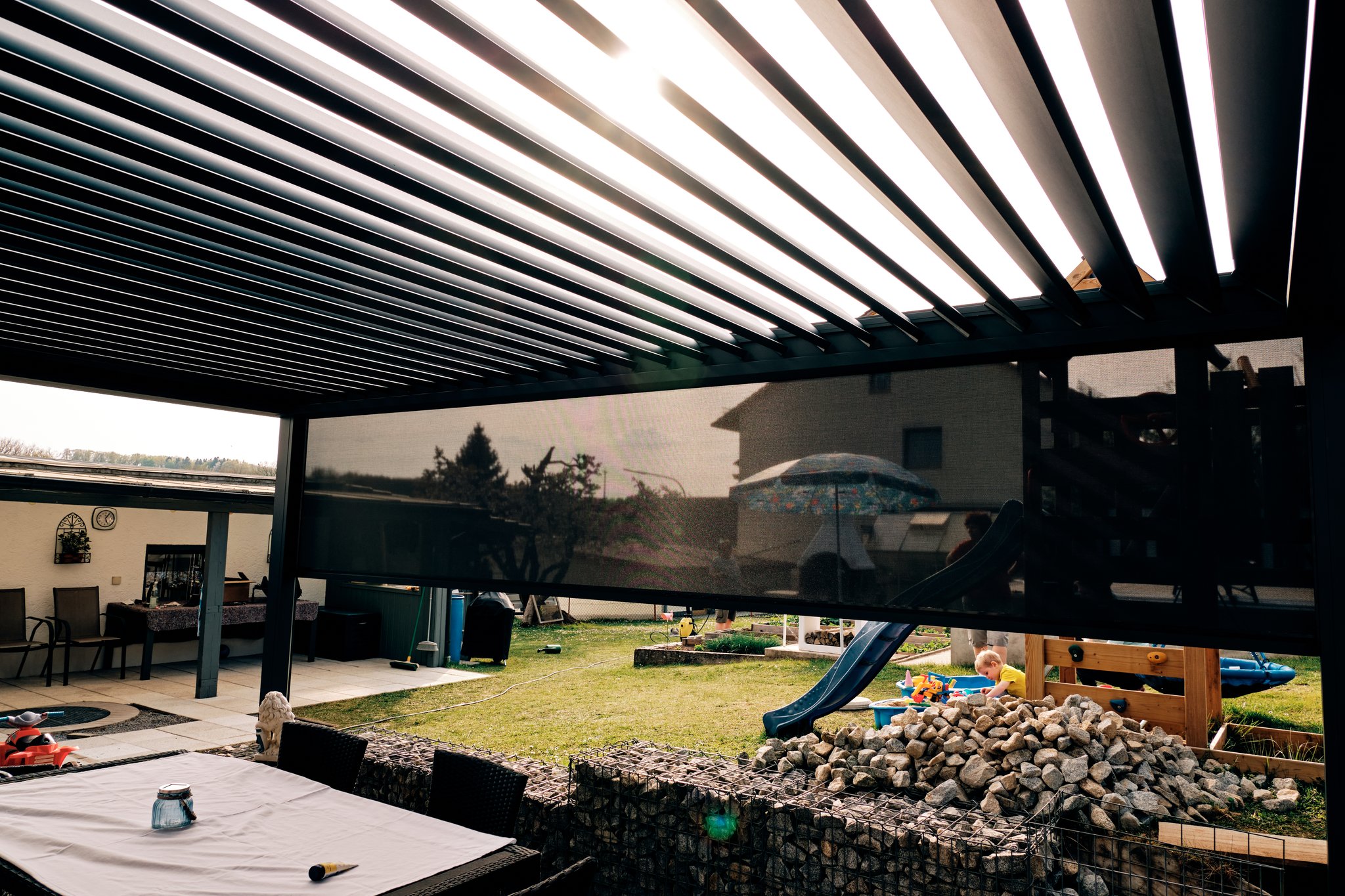 Eine Terrassenüberdachung der Marke Brustor mit den Maßen 4m x4,5m. Das integrierte Zip-Screen sorgt für zusätzlichen Sonnen-& Windschutz und die LED-Beleuchtung in den Lamellen spendet